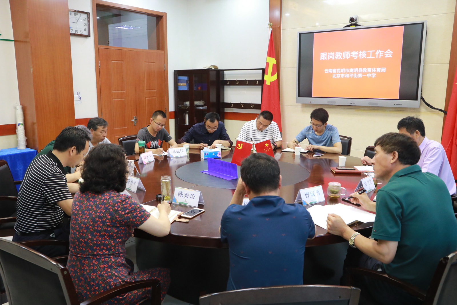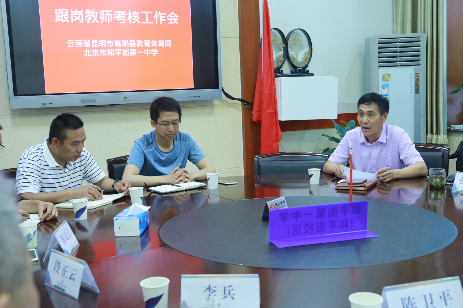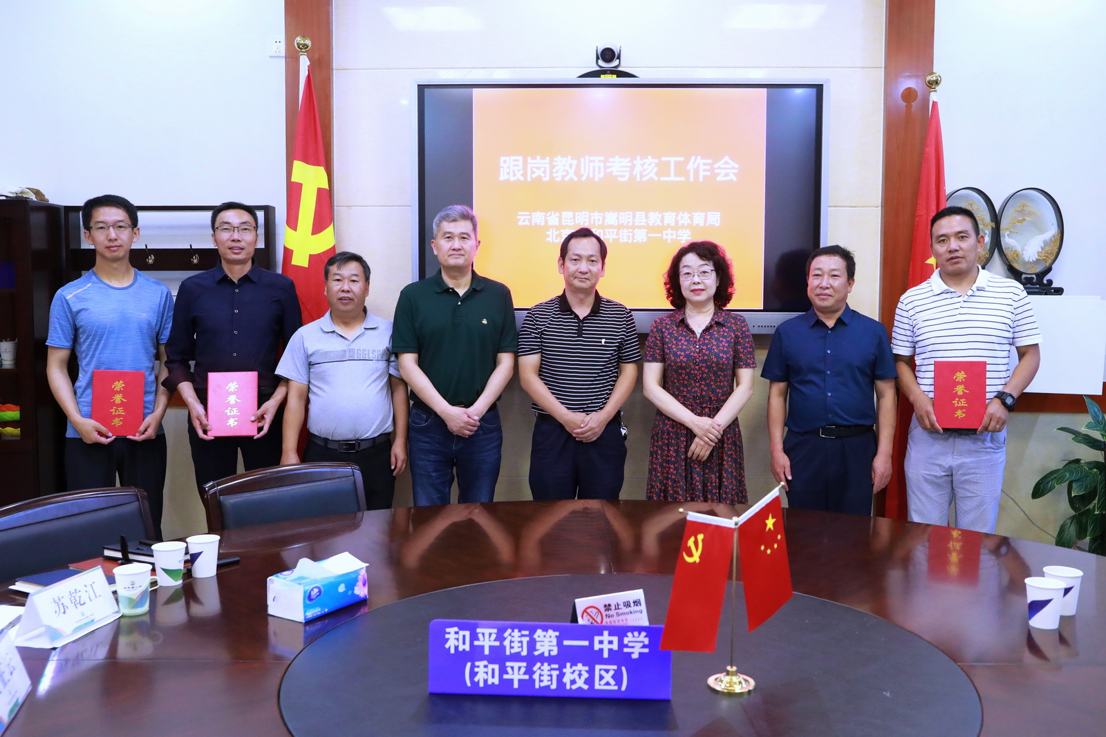 2019年6月12日,和平街一中在和平街高中校区召开跟岗教师考核工作会,对由云南省昆明市嵩明县教育体育局委派来校跟岗实习的三位跟岗实习干部进行考核。嵩明县教体局副书记陈卫平,嵩明一中校长施猛、书记段正云,和平街一中校长陈秀珍、书记李兵、副校长曹成勇、副校长蒋文杰、校长助理张习文及三位跟岗实习干部参加了会议。