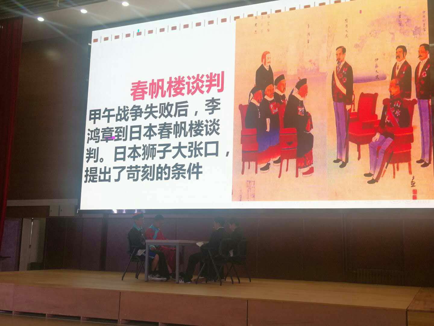 初一17班排演的《马关条约的签订》,甲午战争失败后,李鸿章去日本春帆楼谈判,伊藤博文态度强硬:“实力相当时,外交就是力量;实力不等时,力量就是外交”,这样的台词出自初中学生的创作,真是后生不可小觑。弱国无外交,李鸿章在谈判桌上的弱势深深刺痛了青年学子的心,让他们重新思考国家实力和外交的关系。