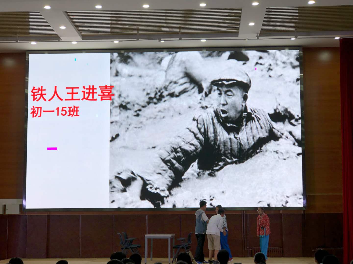 15班同学以精湛的演技诠释了铁人王进喜,当他为了阻止井喷,不顾性命跳下钻井,不禁让人热泪盈眶。