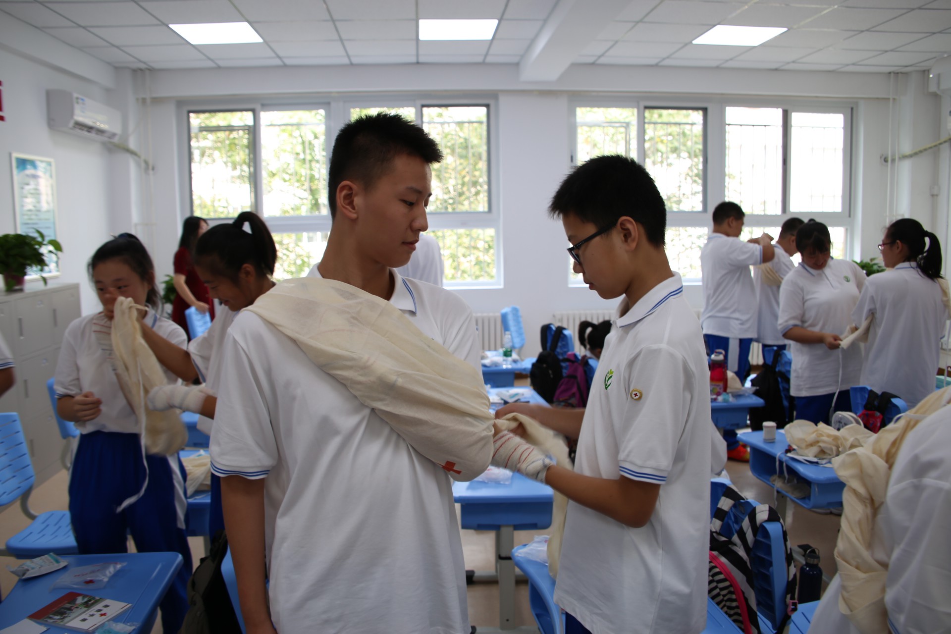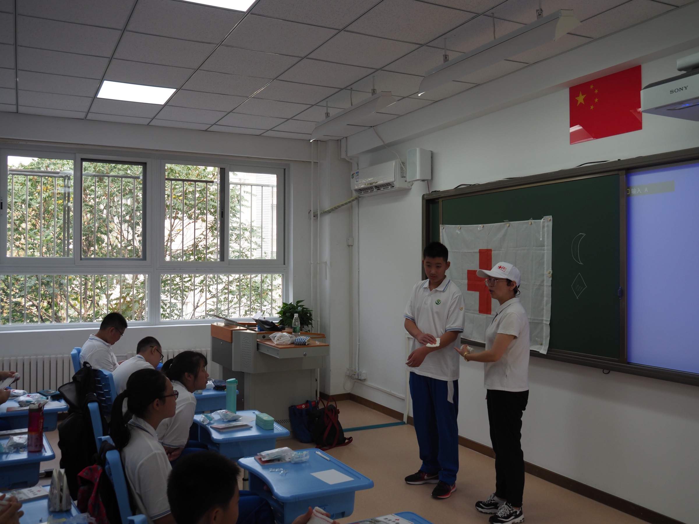实践,朝阳区红十字会的老师为同学们进行了急救培训,同学们不仅了解到自救和互救的基本原则、方法和常识,还在老师的指导下实践绷带的包扎方法,收获颇丰。