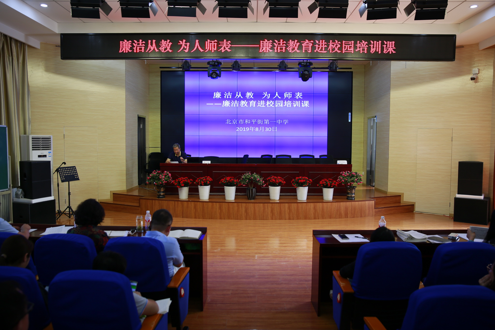 2019年8月30日,在新学年到来之际,和平街一中党总支书记李兵为廉洁文化进校园讲了一堂生动的党课。全校六个校区干部和教职工代表参加了廉洁从教培训。