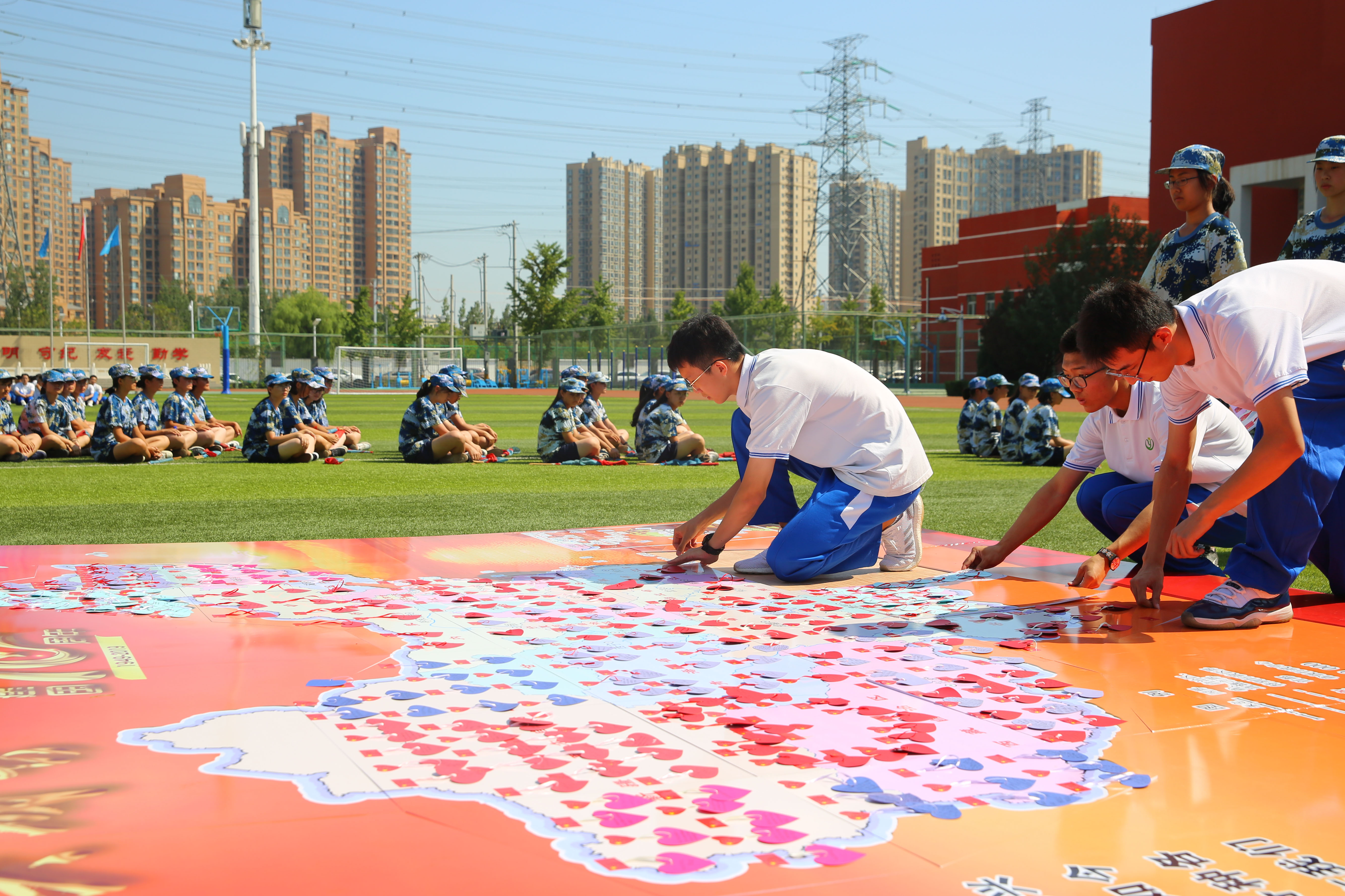 最后,为了祝福新中国70华诞,各班学生代表共同协作,拼出了祖国的地图,并将祝福写在心愿卡上,挂在中国地图的每一个角落,用满腔的热情向祖国献礼,用行动告诉世界,中国,一点都不能少!