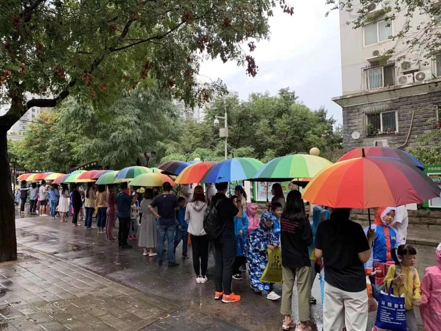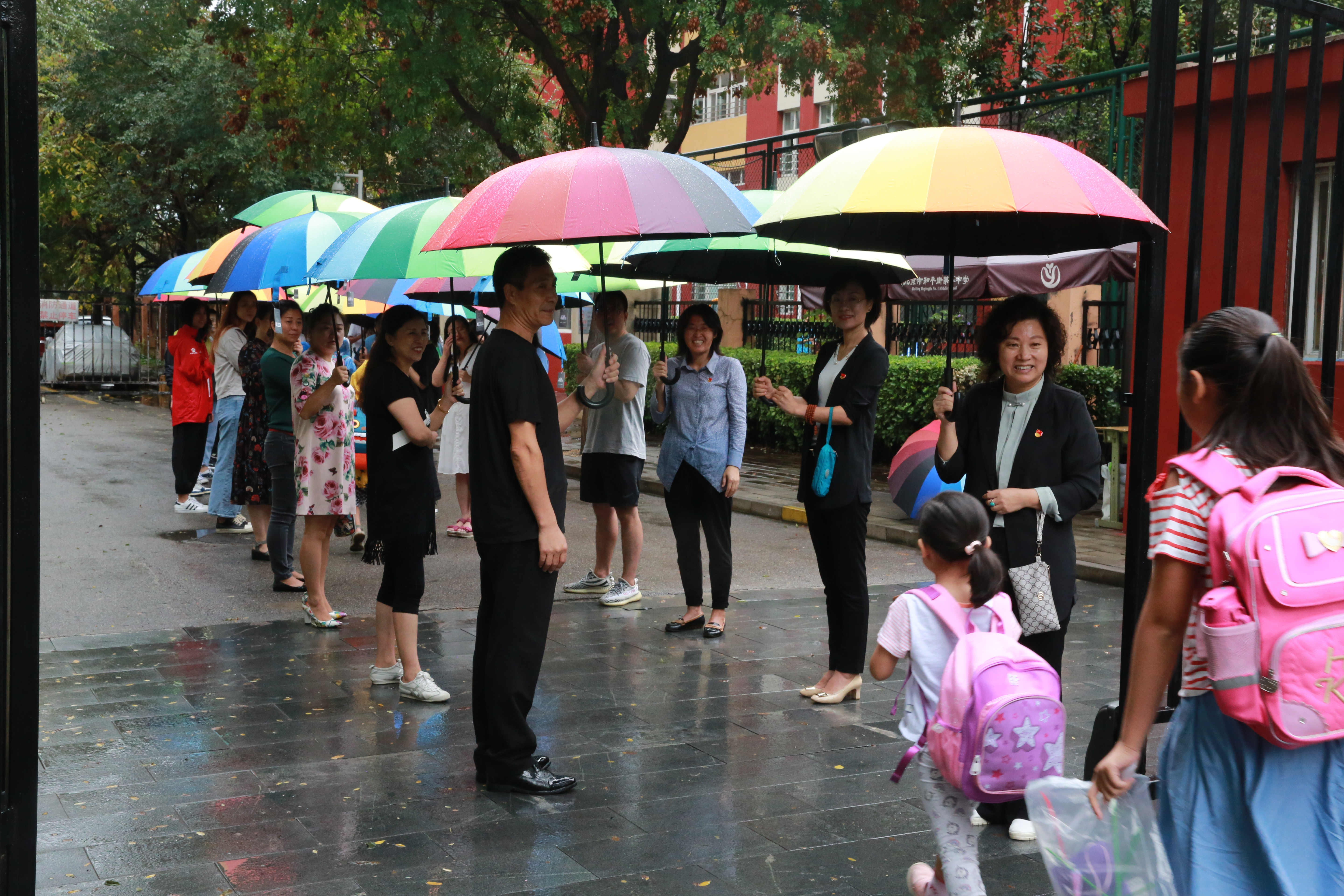 2019年9月10日,北京市和平街第一中学清友园校区的老师们迎来了第35个教师节,恰逢入秋的第一场大雨而至。早上6:50左右,早早到校的校领导们,想到孩子们进校门后不能打伞,那校门口到教学楼的这段距离就会把孩子们淋湿,于是,在校区主管校长殷桂萍的带领下,副校长蒋文杰、校长助理陈立红等行政领导一起举起了伞,站在校门口相向而立,老师们见了也纷纷仿效,很快,校门口和教学楼之间的道路连接起来,一座遮雨的“彩虹桥”出现了。