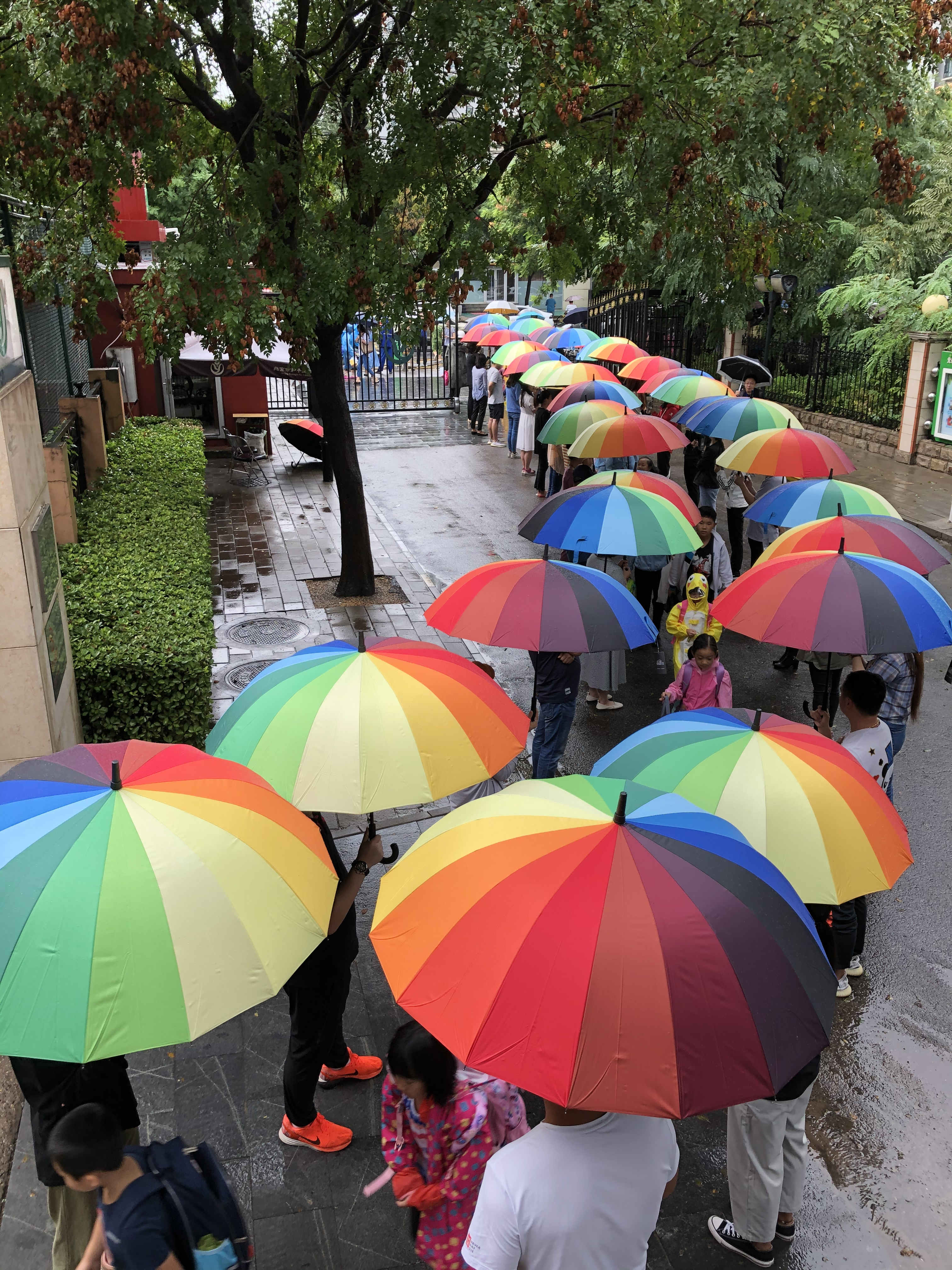 殷校长说:“我们的教育理念,就是把孩子们培养成有温度的人,能够关爱他人,帮助他人。爱心的传递,可以沁人心脾;可以温暖人心;可以传递快乐。当老师们用自己手中的伞架起一座五颜六色的桥,那么这座桥就不仅是架在校园里,更是架在孩子们的心里。”雨中彩虹桥是学生们心中的彩虹,穿过“彩虹桥”的短短几十秒时间感受到的暖意,一定会长久地留存在许多同学的记忆深处,潜移默化地影响他们今后的为人处世。