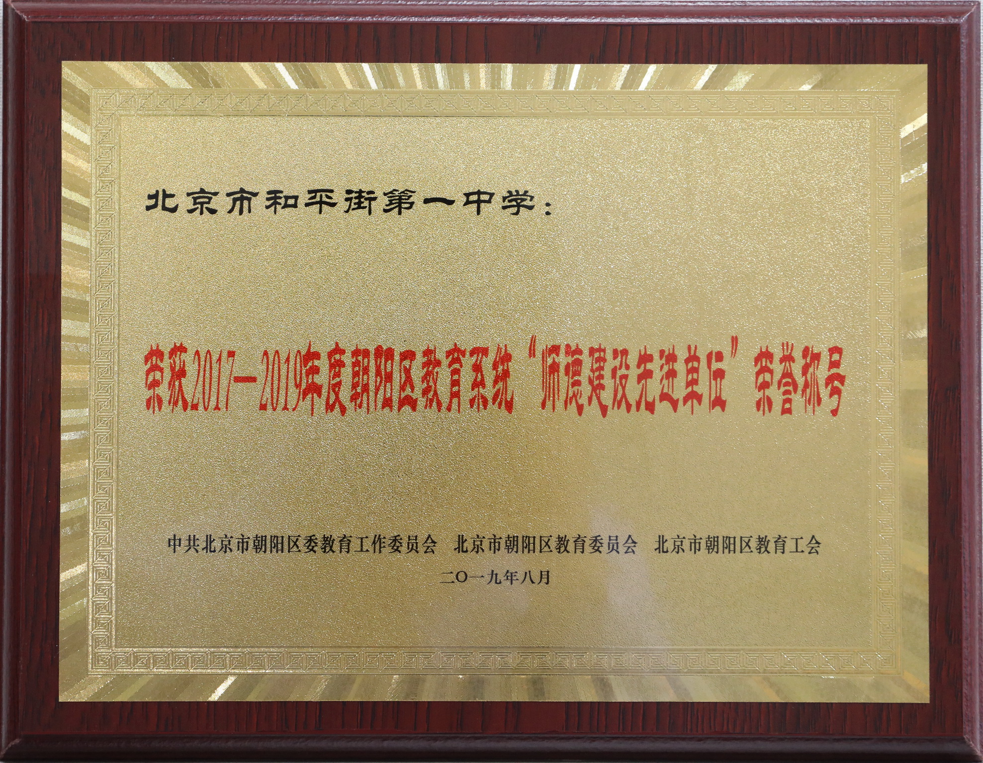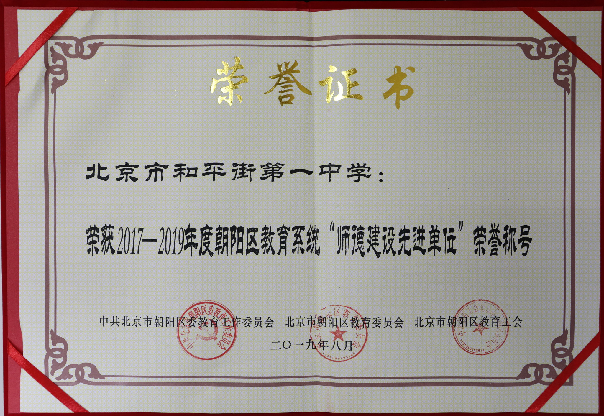 2019年9月9日,朝阳区教育系统举行2019年新任教师入职教育暨教师节庆祝活动,对2019朝阳区教育系统师德先进集体及个人进行了表彰。和平街一中喜获2017-2019年度朝阳区“师德建设先进单位”荣誉称号。在此,对学校表示热烈祝贺!