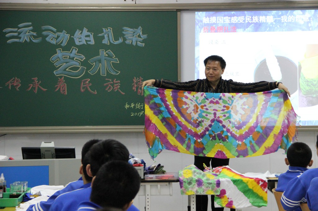 这是一节学生动手制作“扎染”的实践操作的课程。扎染技艺在2006被评为是我国的非物质文化遗产,是一种独特的手工防染艺术。扎染以其鲜明的艺术个性,展示着独特的艺术魅力,作为物化的文化载体,反映着不同地域、不同民族共同体的文化现象和印染文化史的痕迹。本节课让学生们了解中国的传统文化,基本的制作方法,培养学生们的爱国情怀,责任担当意识。李老师分别用网络上、生活中和重大活动(70年国庆)中的扎染服装的图片,制作成视频进行播放。从不同的视角来引导学生们了解到扎染艺术在人们生活中的影响。认识到扎染技术已经走进普通百姓的生活,走上了中国的大舞台,走出了国门,走向了世界。