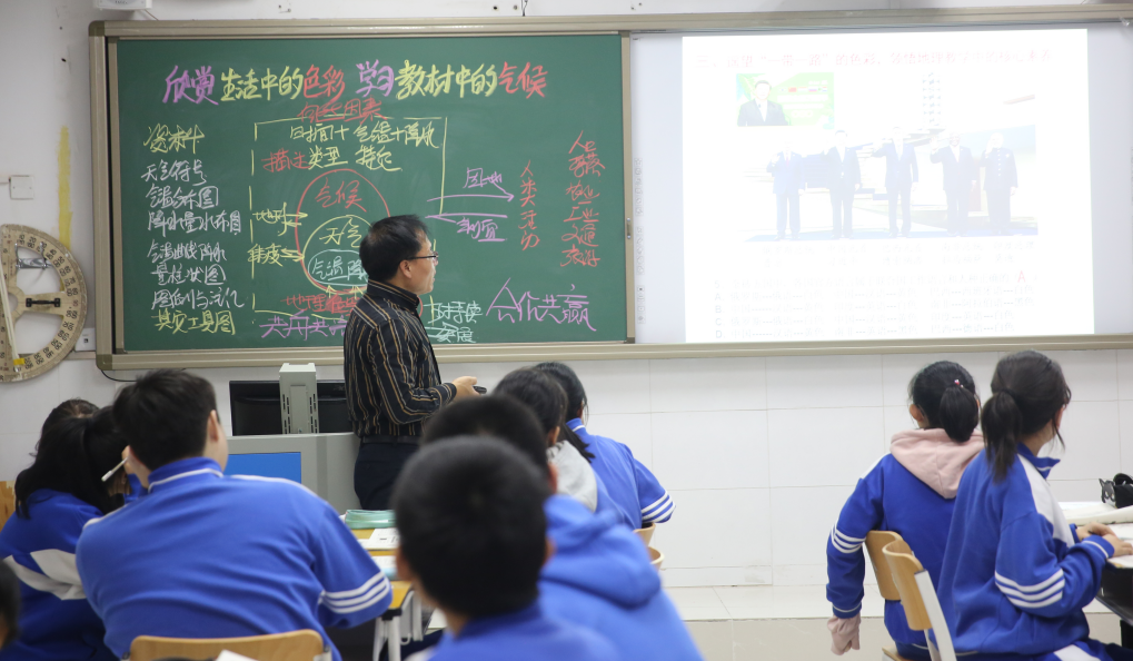 梳理知识结构,提升学生们的学习能力:地理的碎片知识很多,向葡萄珠一样,让学生们无从下手,如何让更多的葡萄珠不散落,能互相串起来,就要有知识的骨架,让骨架把散落的葡萄串起来。所以,学法指导也很重要,李老师在讲了3个案例之后,带领学生梳理天气与气候的知识框架,从天气与气候的组成因子,区别与联系,从使用专门的地理工具,到影响因素的相互影响,到人类活动对天气与气候的影响,再到习近平主席提出的走可持续发展道路,与“一带一路”沿线国家的同舟共济到合作共赢创建美好未来。将地理教学与时事政治,爱国教育紧密的结合起来。