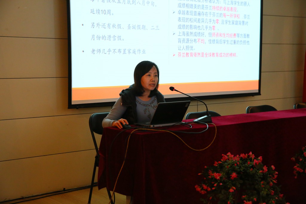 英语组教研组长陶曲萍和政治组教研组长冯燕玲分别谈了芬兰教育与中国教育的差异,也重点介绍了芬兰教育“少即是多”的理念,以及教育追求自由、平等、尊重,还介绍了其课程建设的亮点,中芬核心素养之对比,以及由此带来的反思:学科内的整合、学科间的整合、校内外的整合。她们认真、严谨的治学态度,深刻、创新的教育思考,获得大家一致好评。