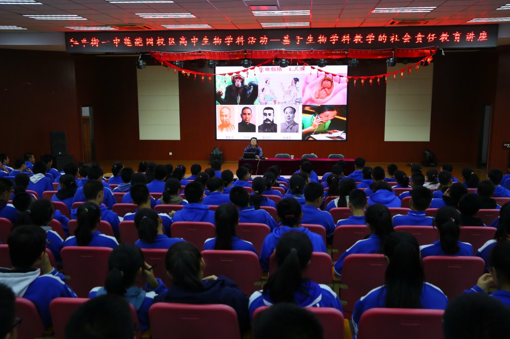 2019年11月29日下午四点至六点,北京市和平街第一中学莲葩园校区高中生物学科月活动在五层阶梯教室举行。此次活动,特邀了中科院生物与社会学专业的高银相教授为高一、高二两个年级近500名学生作了“基于生物学科教学的社会责任感教育讲座”。全体生物老师和高一、高二全体班主任及学生发展处的老师全程参与了活动。