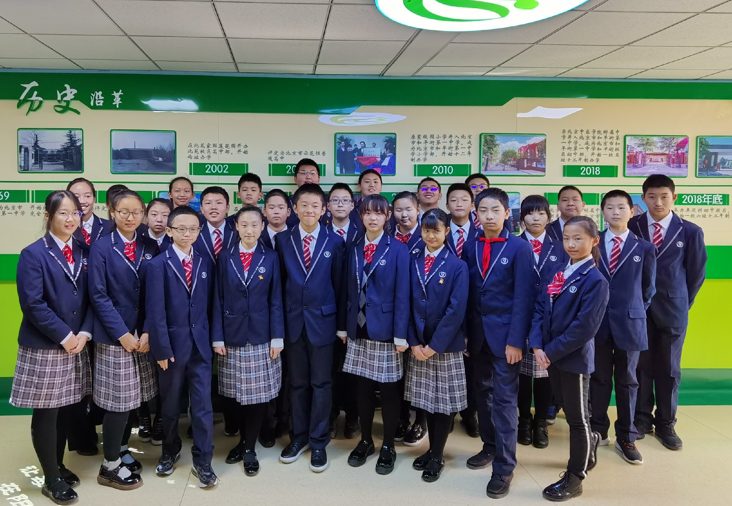 周六的清晨阳光明媚,奥运村校区初一年级部分学生,身着统一制服,精神饱满、朝气蓬勃地站在学校门口,迎接前来参加活动的国音附小学生。
