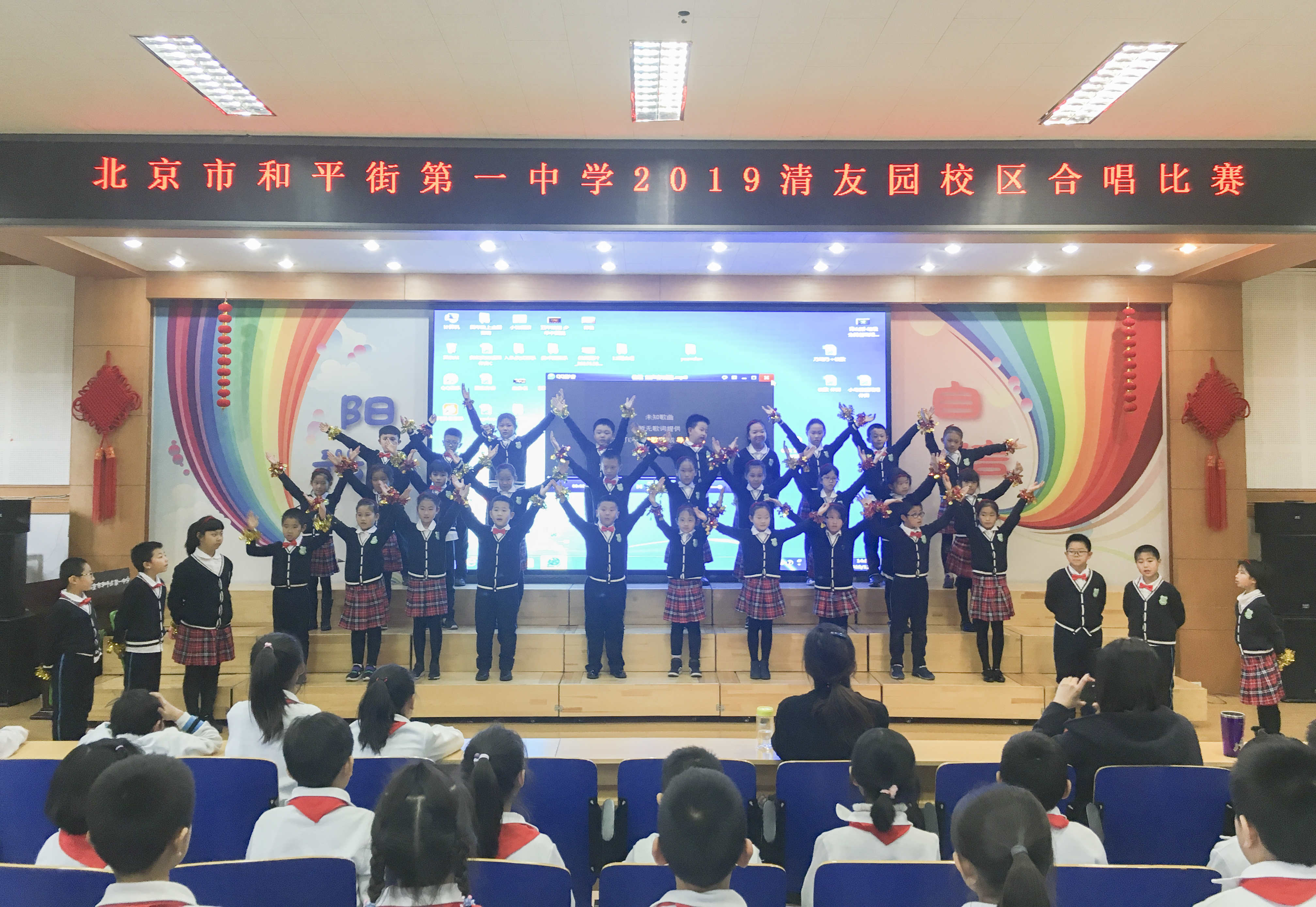 “迎着朝阳,踏着青春的步伐,我们的梦想,从这里起航,立志勤奋,求实开拓,在风雨中锻炼,在自信中成长,和平街一中,我们成长的摇篮,书声朗朗,团结友爱,生活充满欢乐,和平街一中,我们求知的殿堂,带着先辈的期盼,胸怀祖国的明天……”在2020年到来之际,为丰富校园文化生活,营造健康高雅的校园文化环境,北京市和平街第一中学清友园校区组织全校学生开展了合唱比赛活动,每个班的同学都挺着笔直的腰杆,脸露微笑,专注的眼神目不转睛地盯着台上的小指挥,嘹亮的歌声唱着和平街一中校歌,唱出了爱校之情。