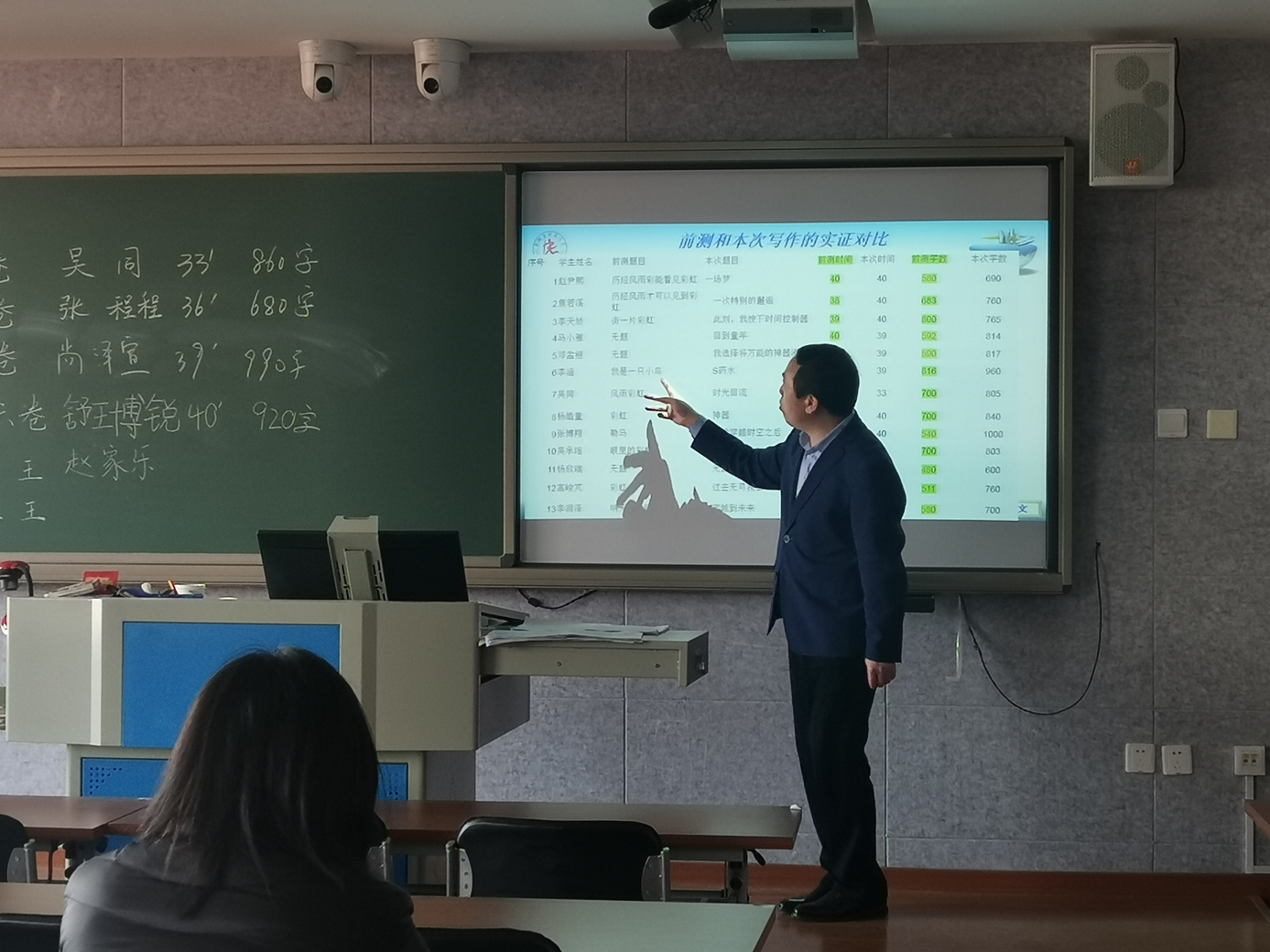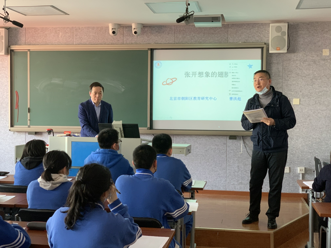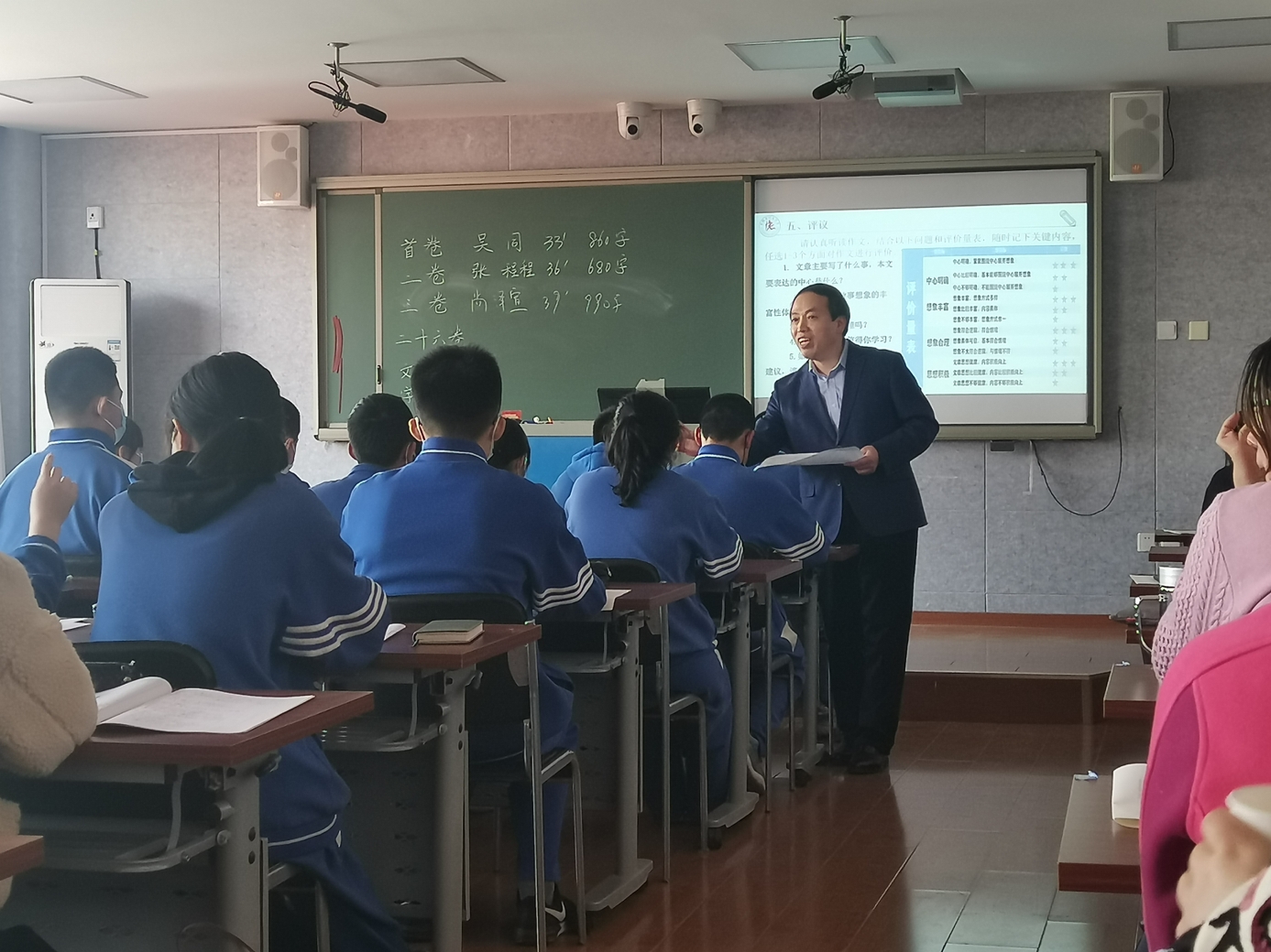 会议分为两个部分,首先由曹老师为朝来校区初三(7)班的学生上了两节新概念快速作文训练课。之后他就新概念快速作文的理论与实践,及成果推广等方面与老师们进行了交流。