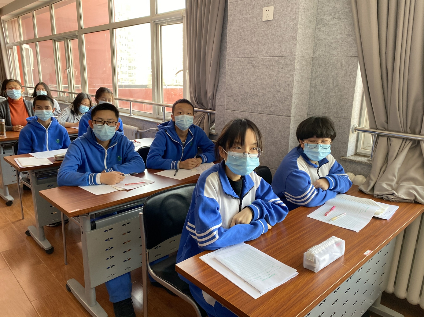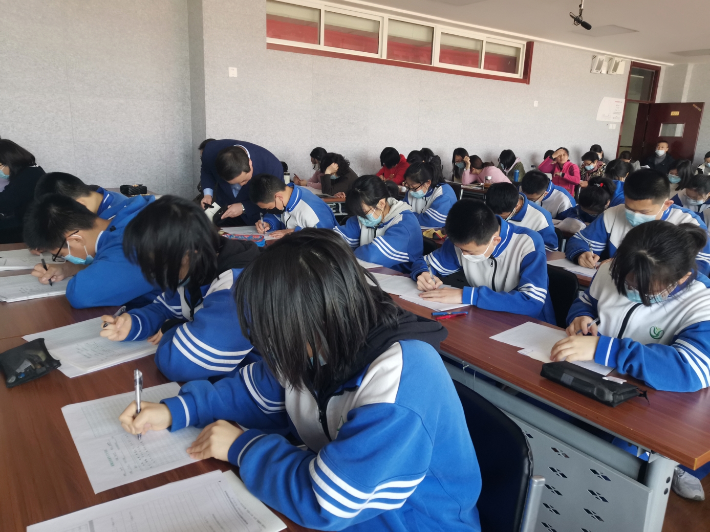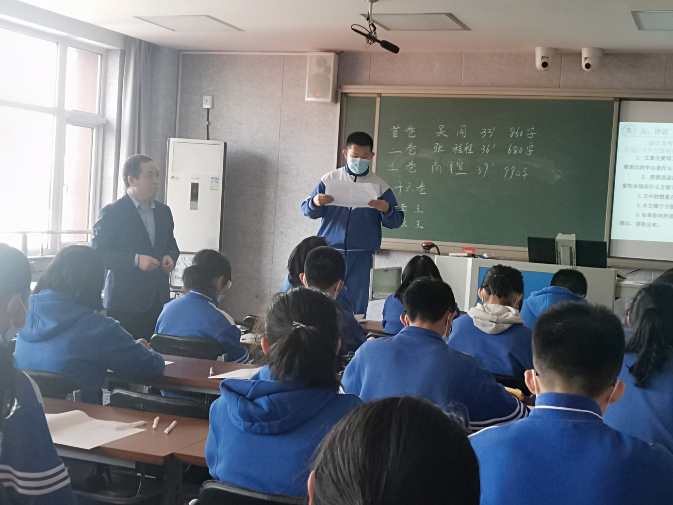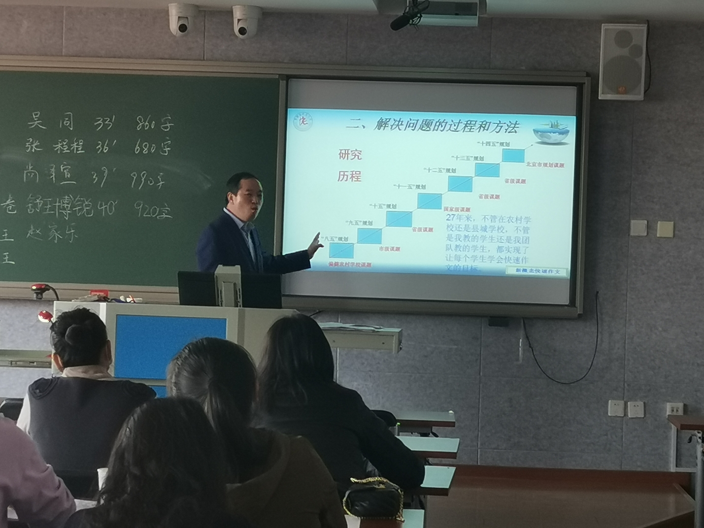 会议分为两个部分,首先由曹老师为朝来校区初三(7)班的学生上了两节新概念快速作文训练课。之后他就新概念快速作文的理论与实践,及成果推广等方面与老师们进行了交流。