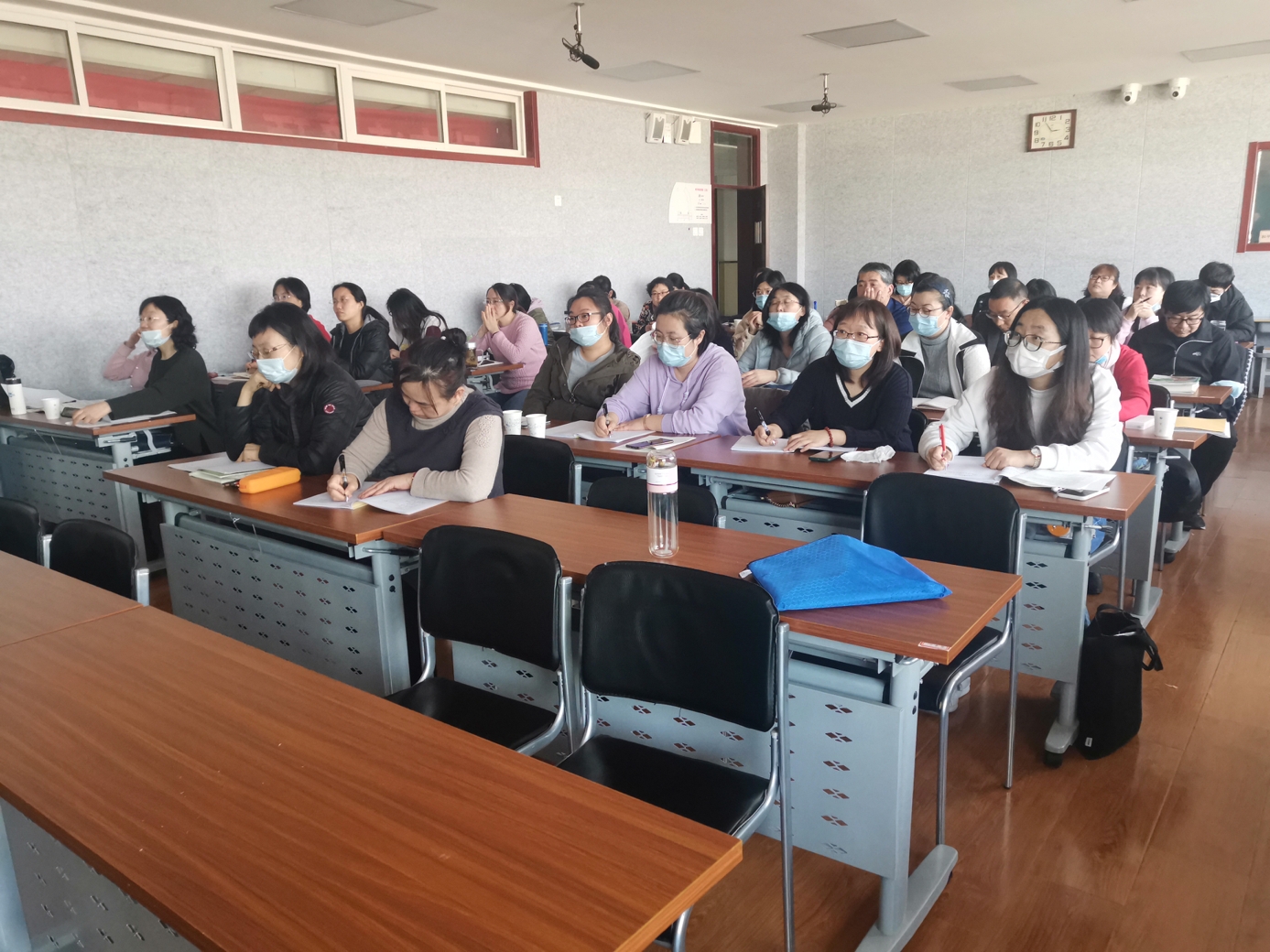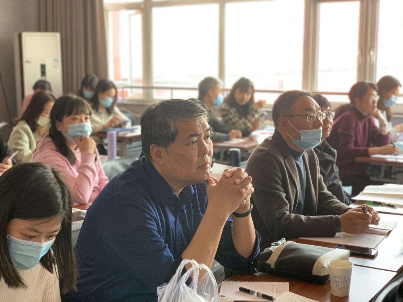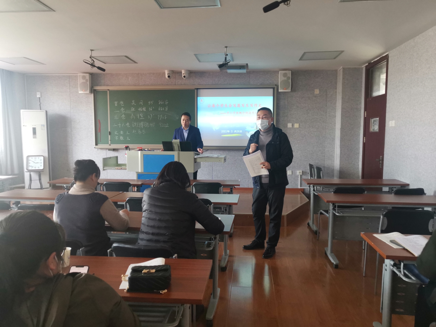 示范课结束后,稍作休息,曹老师便针对本次课堂课程设计思路,跟老师们展开交流。他谈到如何提升学生的写作能力的问题时强调:传统的教学是老师讲评,学生写作;而新概念快速作文练习课,是以学生为主体的课堂。学生在评价,批改,反思,表达中自我体验,提升。他们通过与同伴交流互动,总结出自己的不足,及时纠正。目的是要让每个学生愿写,会写,乐写。他提醒老师们:作文写作应具有流畅性,变通性,独特性。特别是独创性,更应引起老师们的重视。此外,曹老师还就新概念作文的理念,解决问题的过程和方法,课程的大致流程等,一一与大家进行交流。他表示,新概念快速作文教学着眼于语文教育,致力于学生一生的发展。它以好方法快抒真感受,以快思维快速善品行,以新视角快写美生活;引导学生追求真善美。老师们或认真聆听或专心记录,或静心思考或交流心得,内心的收获和喜悦溢于言表。