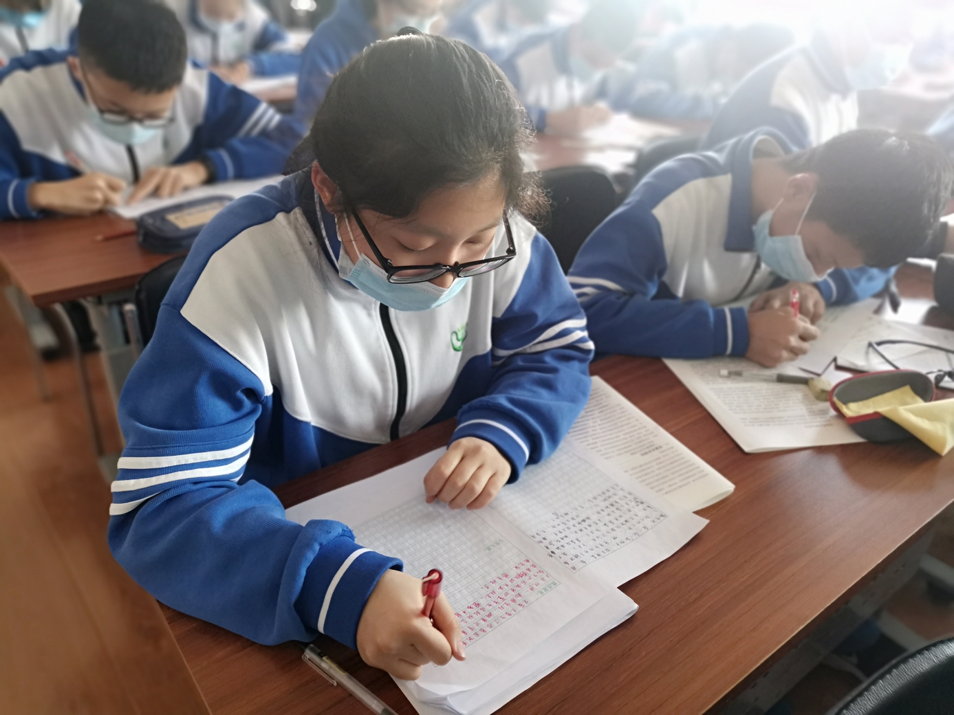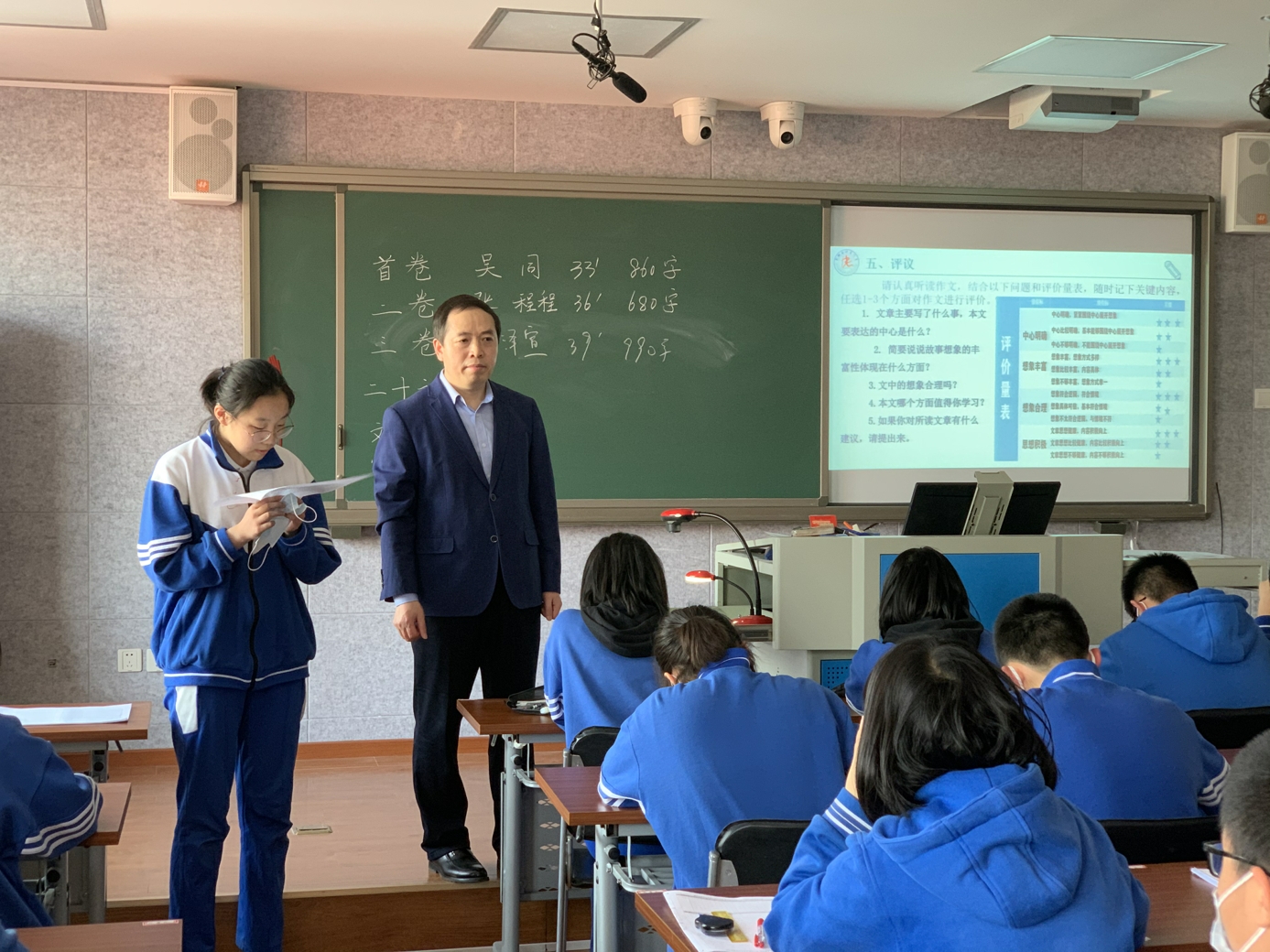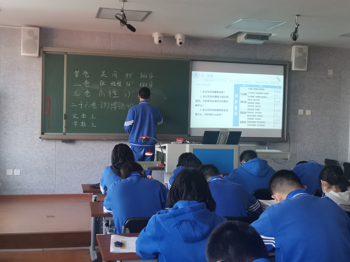 曹老师授课的课题是“张开想象的翅膀”,课堂按“培思——命题——写作——讨论——评议——批改——反思——小结”的流程进行。整个过程以目标为导向,以实践为主线,以评价为手段,充分激发学生写作的主观能动性,让学生在自主实践、自主交流、自我反思中提高写作素养,全体学生在40分钟内均快速完成600字以上的想象作文。完成作文后曹老师带着孩子们朗读并欣赏作文,学生们津津有味地分析、互评,在对所评作文书写100字左右的评语的基础上,自己再完成100字反思,完整的呈现了作文教学的全过程。