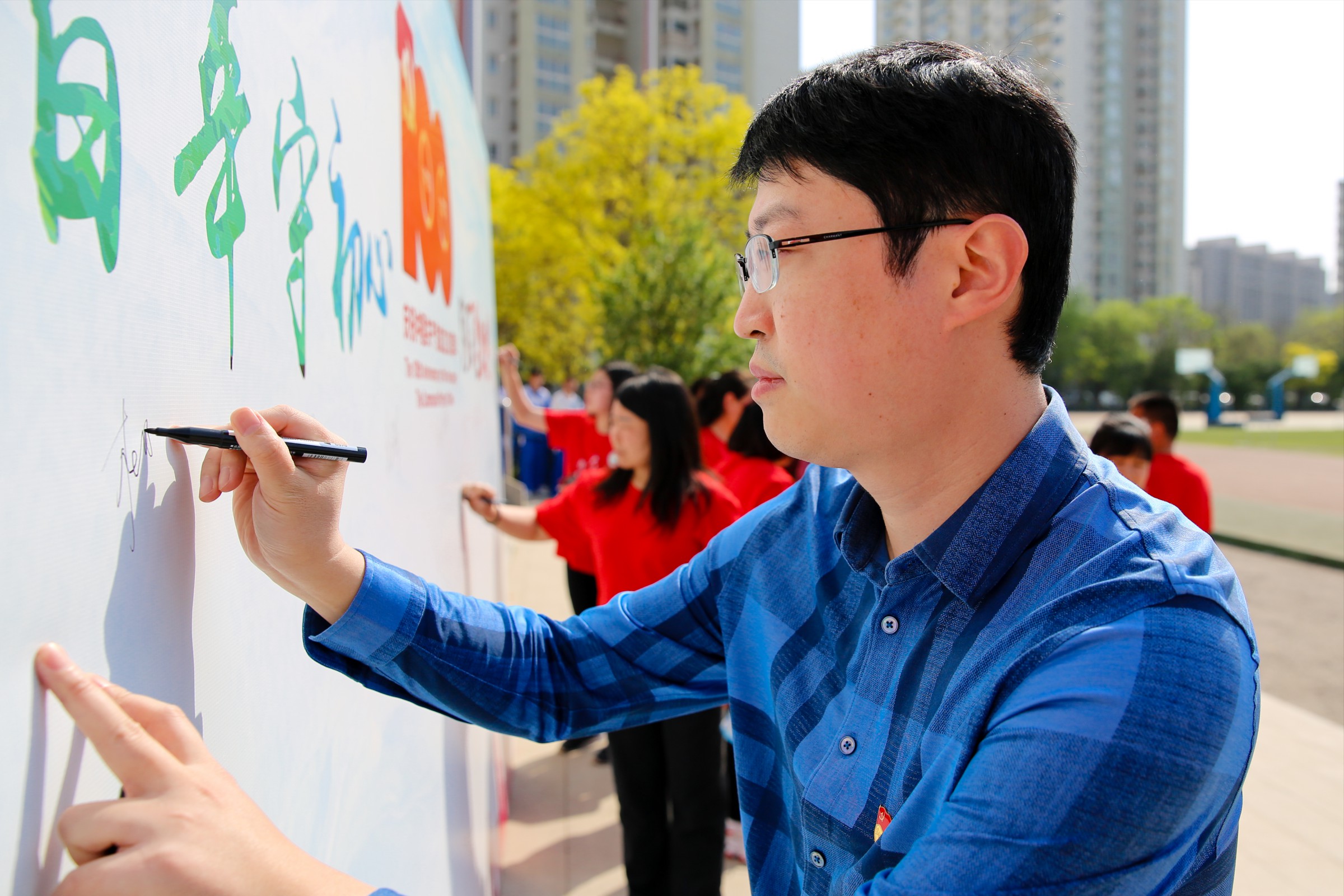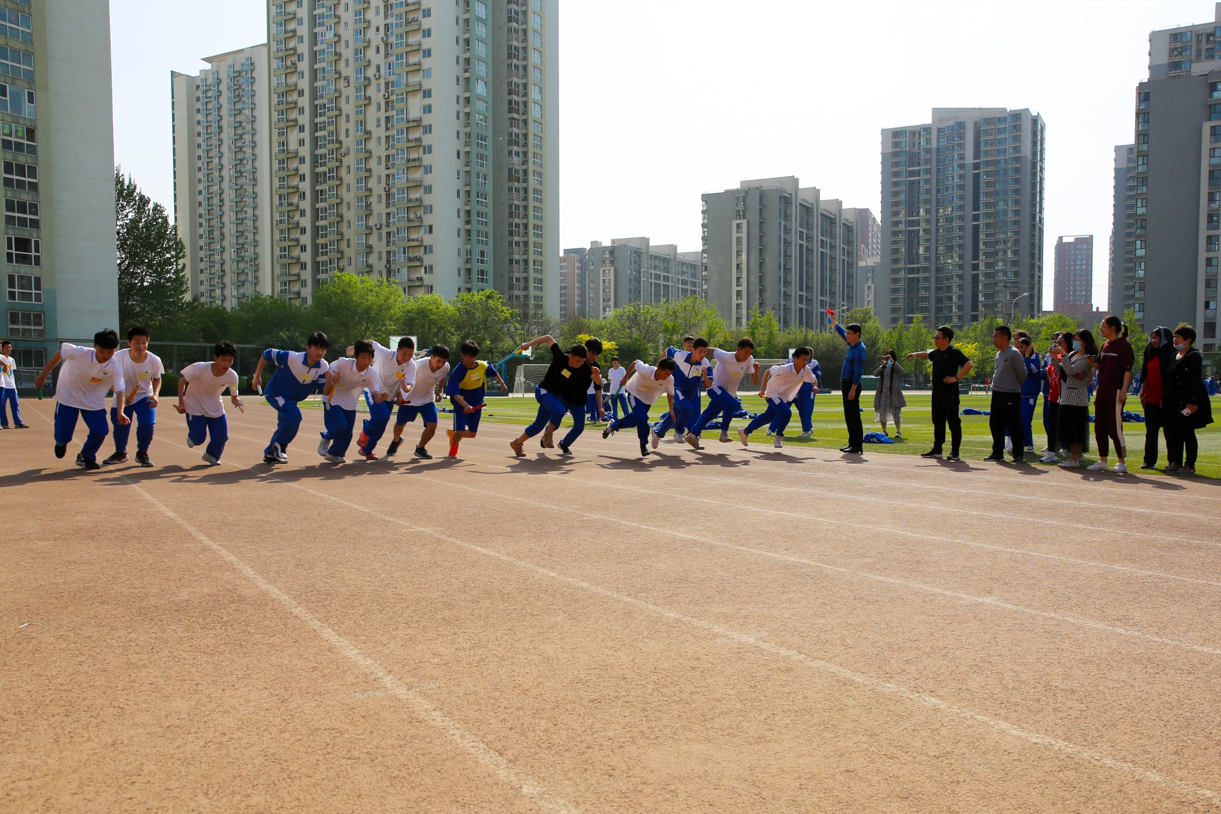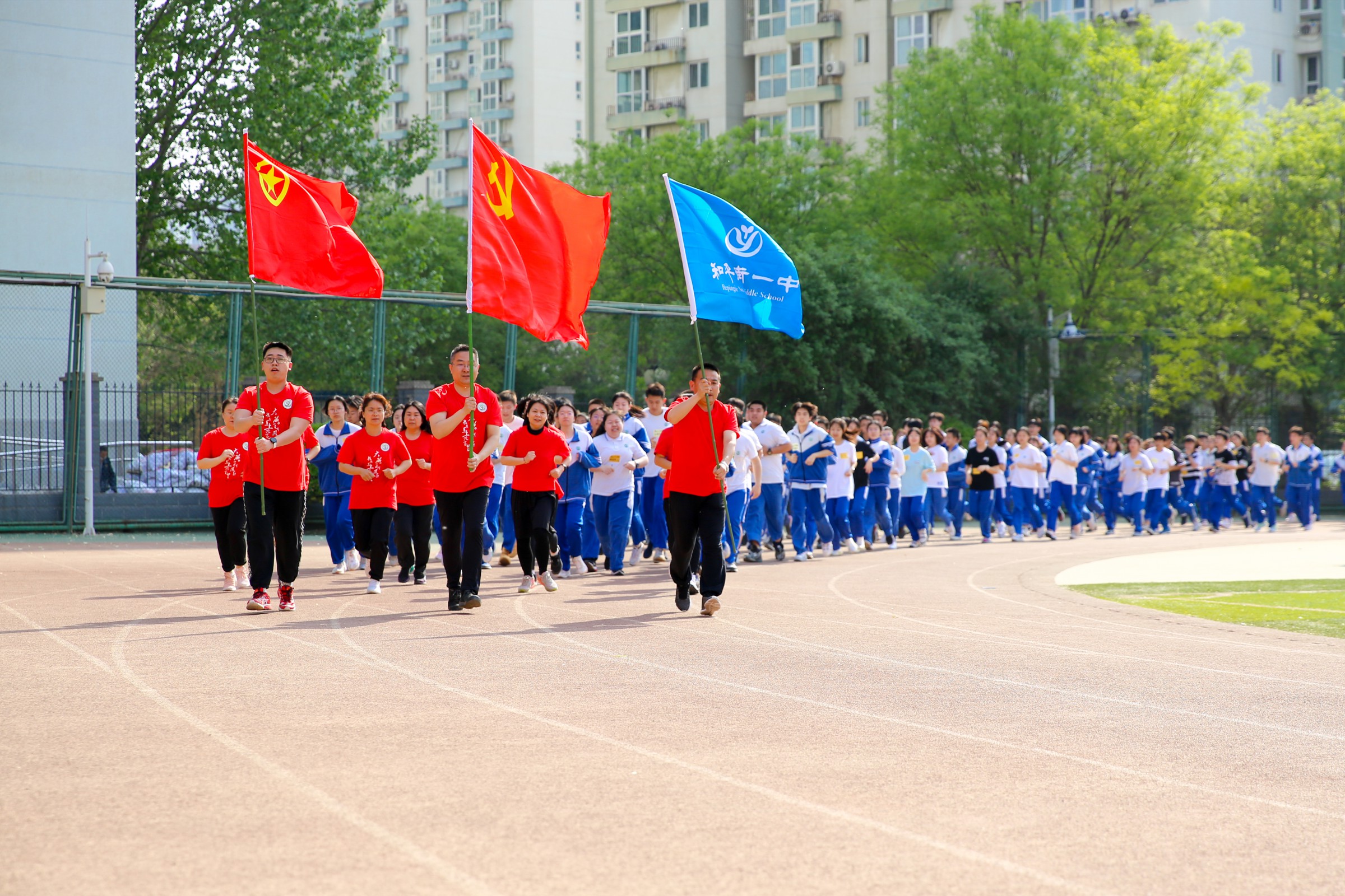 活动仪式由学生发展处白林主任主持。首先杜鹏副校长进行致辞,向全体师生提出要以“功成不必在我”的精神境界,肩负起逐梦新时代赋予的新使命,要有作为,敢担当,倡议师生代表立下铮铮誓言并签字留念。随后,党员教师代表带领学生进行环操场400米跑的热身活动,拉开了全校接力赛的序幕。赛场上,运动健儿奋勇拼搏,呐喊声,助威声此起彼伏,彰显了和一学子奋发向上的精神风貌。
