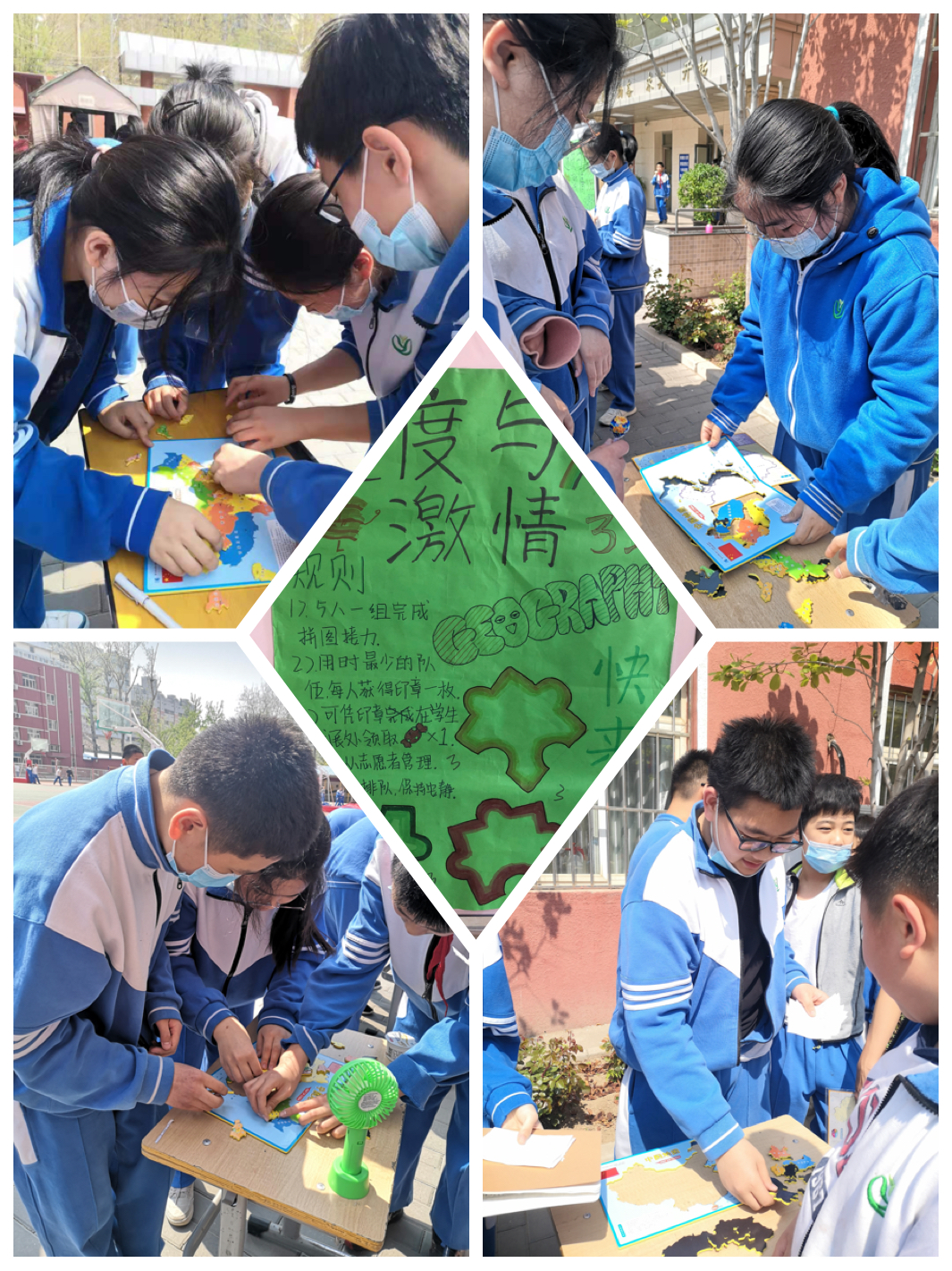 初一3班在4月7日组织的活动上呈现了五套中国地形的拼图,让现场的同学们组队进行接龙拼图,最快的一组将得到奖励。初一的同学们学习到的地理知识非常全面与准确,场场获得第一名的好成绩。班主任田老师全程参与了活动的设计与现场的管理,3班的小干部们也在老师的带领下用心工作,提升了自己的组织协调能力。