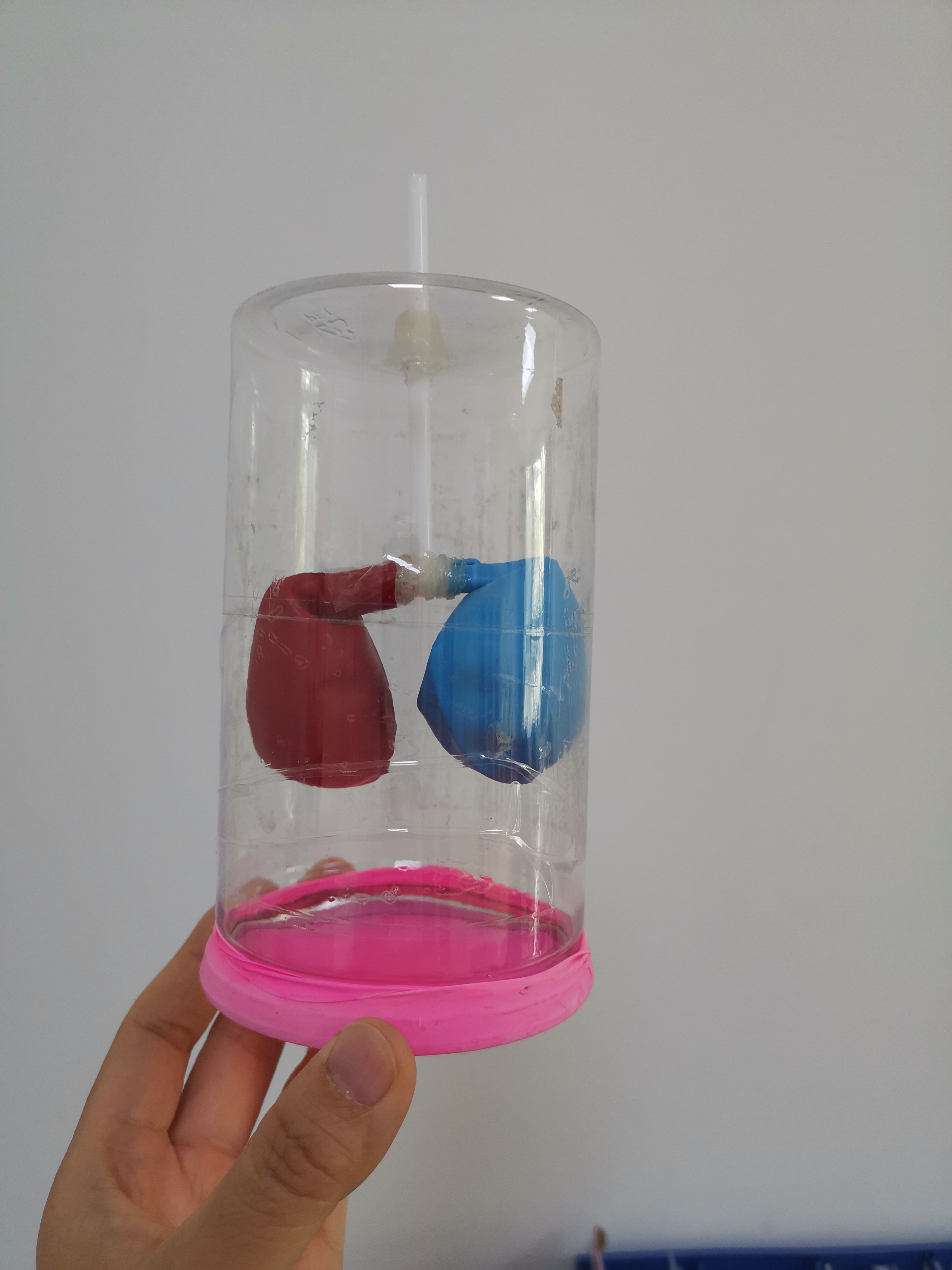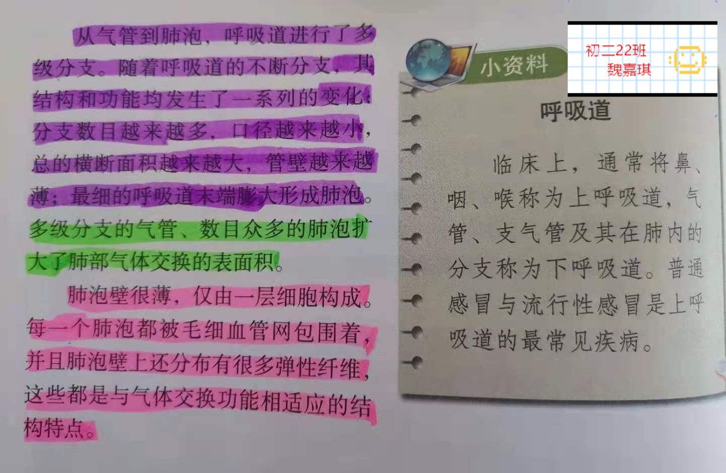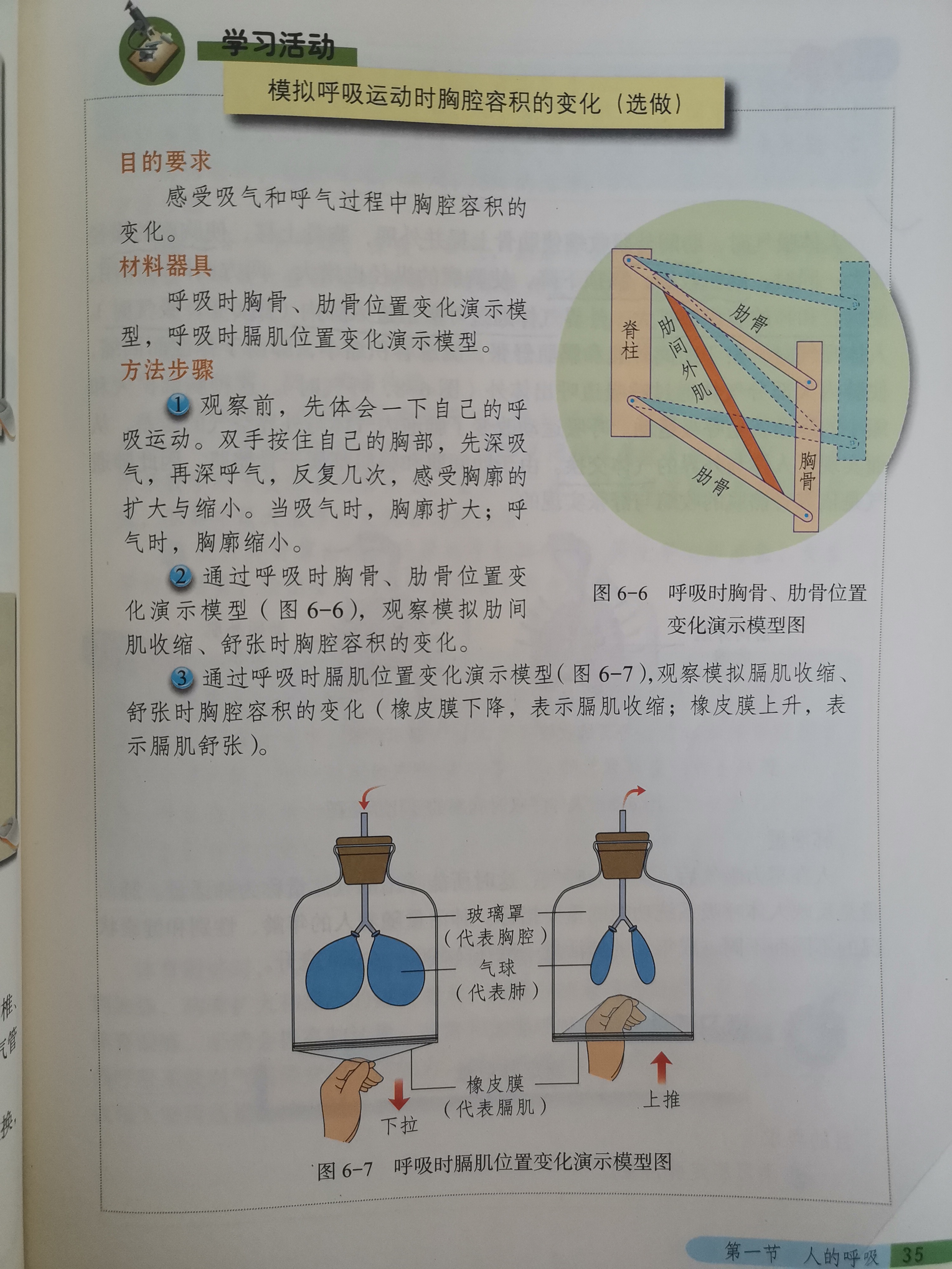 例如初学《人的呼吸》这一章,涉及到体积和压强的问题,由于物理学科知识的缺乏,学生很难理解呼吸运动的原理。在初二学习物理知识后,依照教材制作模型并进行使用和展示,可以帮助学生更加明晰地理解整个呼吸过程。