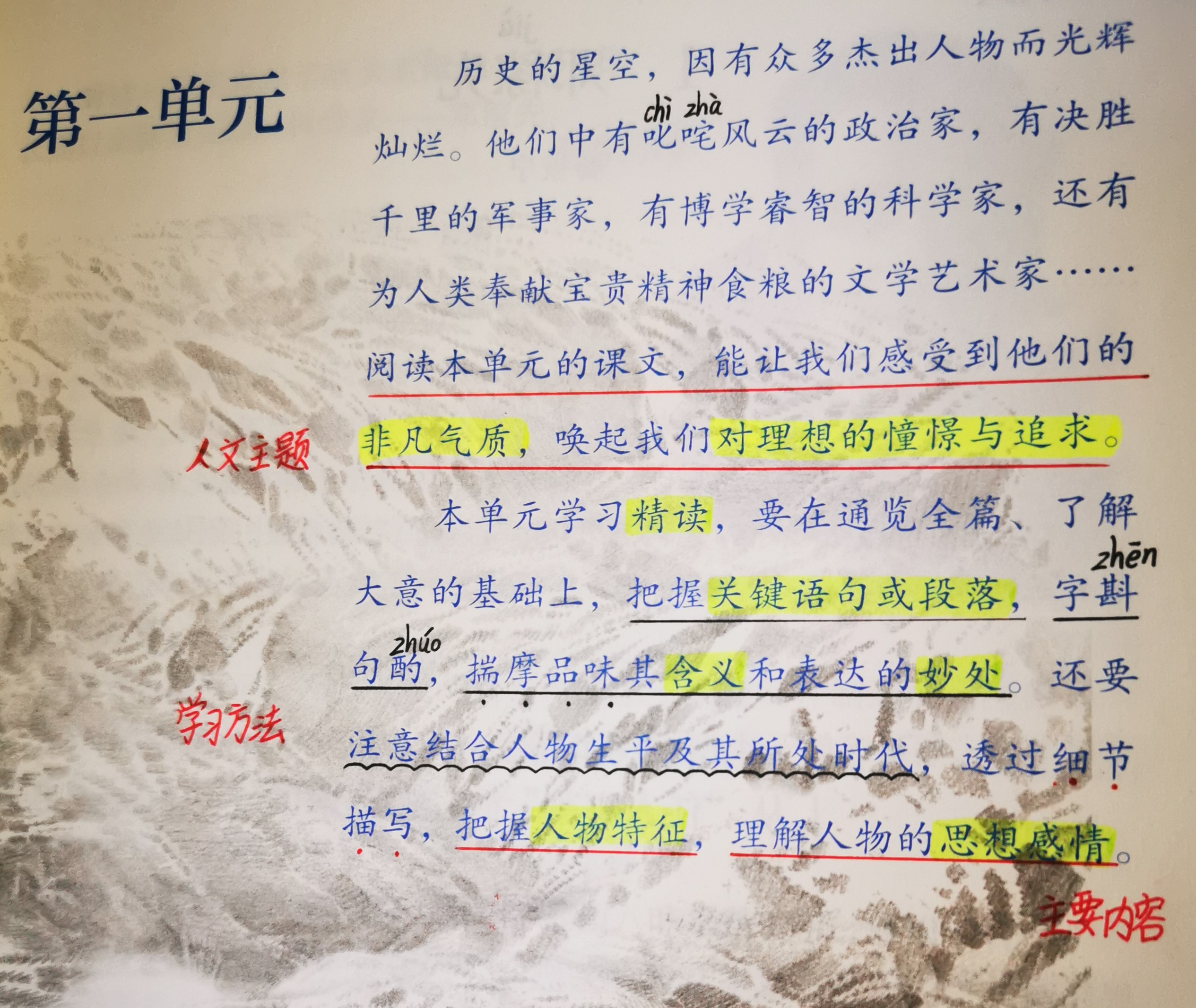 读单元提示,明确单元人文主题和单元阅读方法、需要提高的语文阅读能力。例如:第一单元单元提示第一段明确本单元的人文主题为“感受杰出人物的非凡气质,唤起我们对理想的憧憬与追求。”单元提示第二段提示我们本单元主要学习方法为“精读法”,具体落实的语文知识和能力为“把握关键语句的含义、通过细节描写把握人物特征和理解人物情感。”