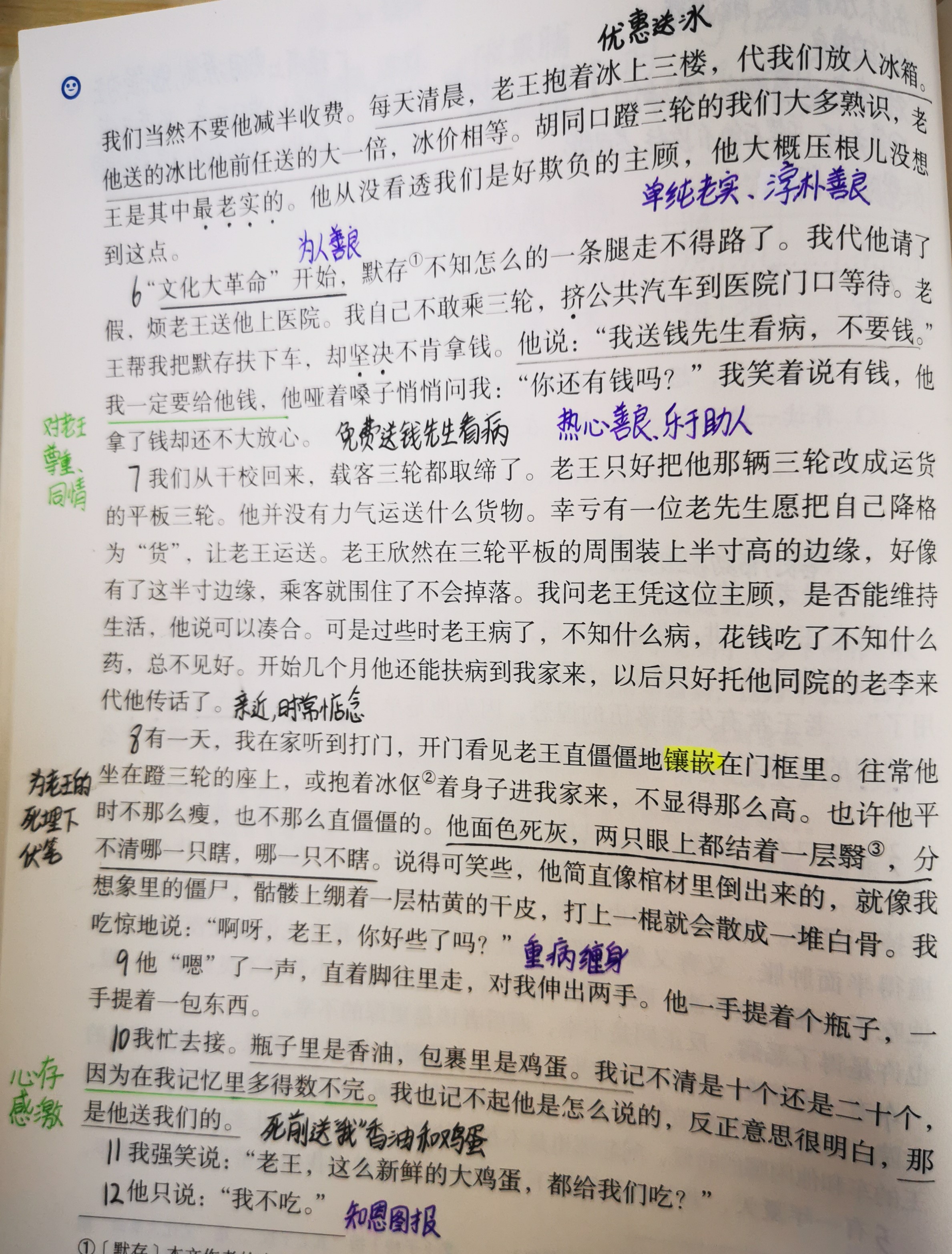 读课文内容,在批注、质疑、分析中掌握语文阅读方法,提升语文整体素养。例如:对教材《老王》的阅读中,通过批注描写人物动作、语言、神态的词语,理解人物形象;通过概括主要事件,培养学生的语言概括能力;通过引导学生质疑文章结尾的“愧怍”,深入理解作者情感。学生的整体阅读水平在分析和质疑中逐步提升。