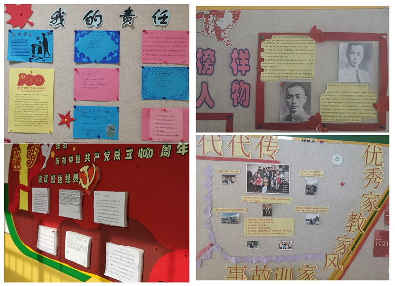 展示活动分为阅读红色经典、学党史明历史、介绍榜样人物、介绍优秀家风和家训故事、学习党史重在力行、奋斗有我使命在肩、见字如面传真情等7个主题。结合不同的主题内容,班级同学充分发挥个人才艺和集体智慧,精心布置。或分享红色书籍《红岩》的读后感;或搜集焦裕禄、陈毅等英雄人物故事,写下学习党史故事后的感想和对英雄们的敬意;还有的班级结合现状谈了如何更好地承担学生的责任;结合自己家庭谈优秀家风家训。年级组也结合相应的主题,布置了办公室外的宣传栏。