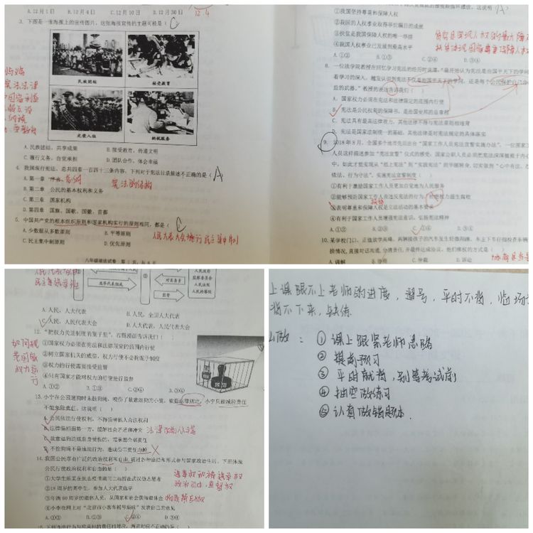 道法学科教师注重学习方法的改进与指导,指导学生自我诊断检测中出现的问题,并结合学生的自我分析进行面批面改,改进学习方法,找准努力方向。