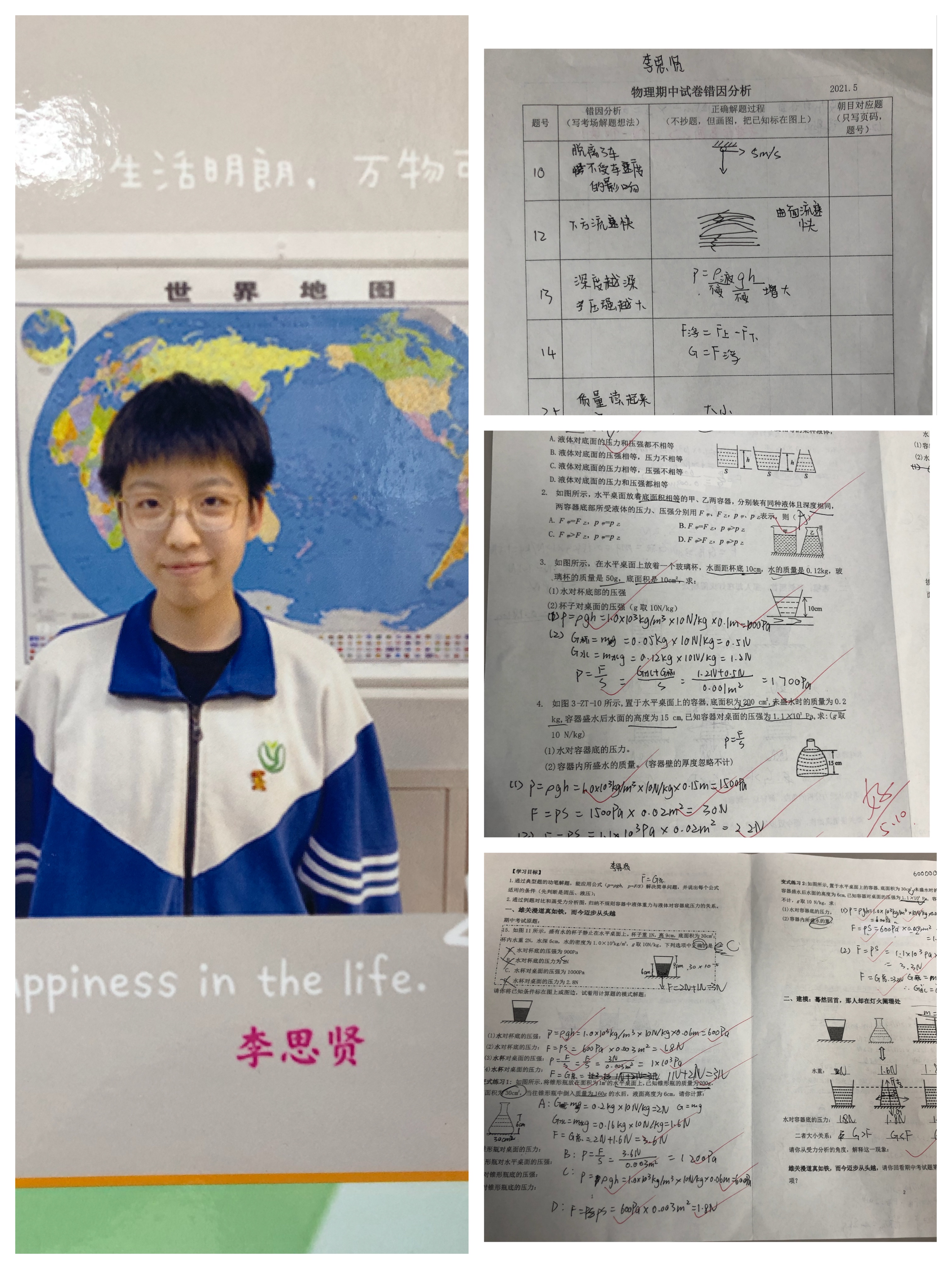 初二19班李思贤同学在错因分析中,发现薄弱知识点的同时,反思了自己的解题方法。面对难题,迎难而上,把选择题当成计算题进行分步求解,通过变式练习,灵活掌握解题思路。