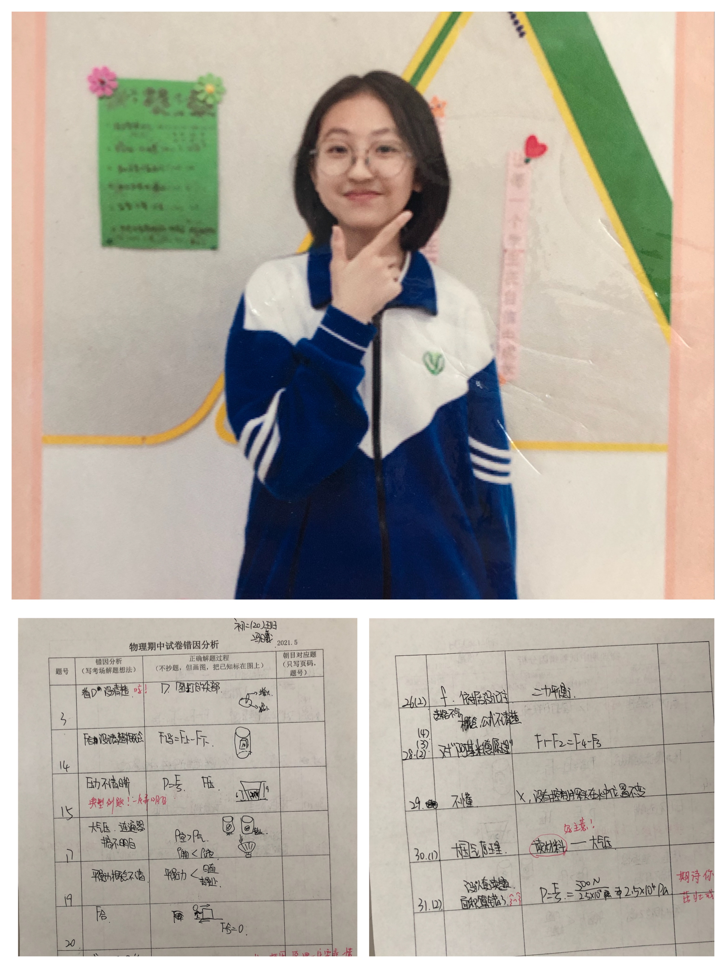 初二20班冯曦同学在错因分析中,发现自己审题不清,概念模糊的问题,通过书写正确的解题过程进行一一核对。在以后的学习中,将理解物理量“是什么,为什么,怎么用”放在首位,重视物理概念的建立过程,严格要求自己。