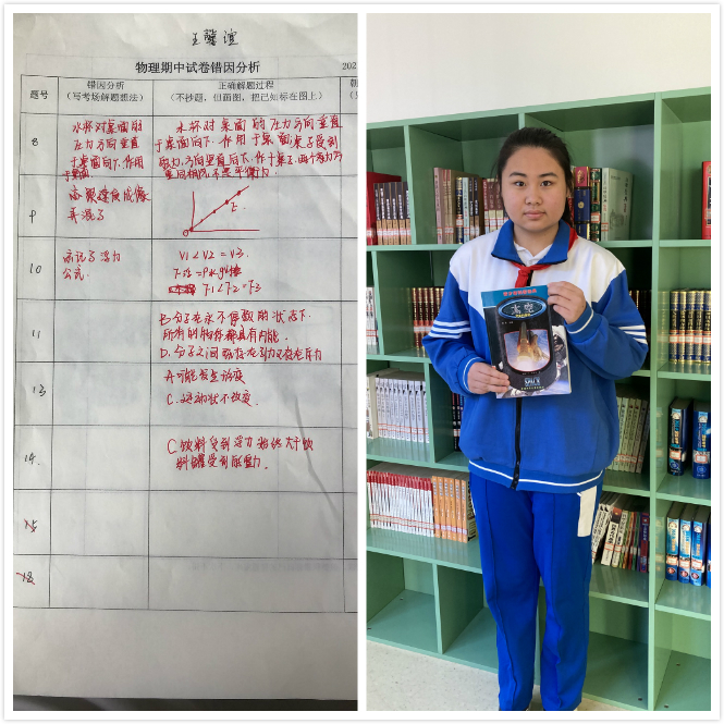 初二20班的周佳乐同学在错因分析中利用画模型图的方式,将易混知识点进行对比,也将重点内容进行错题反思,找出自己学习上的不足。她迅速调整自己的学习方法,重理解,多做变式练习,将每一个知识点吃透弄懂。