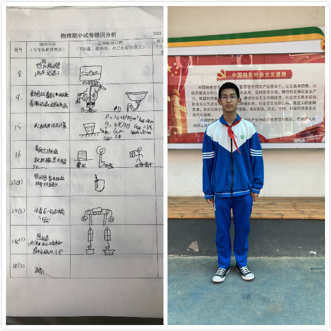初二21班李铭博同学成绩进步较大,对物理这一门学科有着浓厚的兴趣,在学习中需要重点落实基础内容。李明博同学在错因分析中利用画图的方式将文字转化为图片,将知识点可视化,方便自己消化吸收。