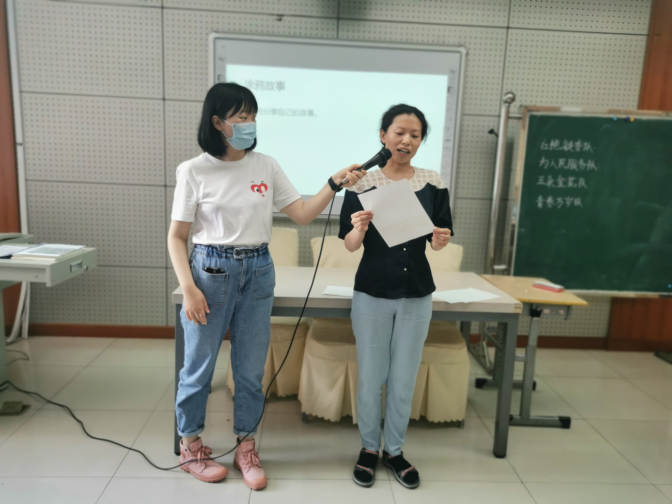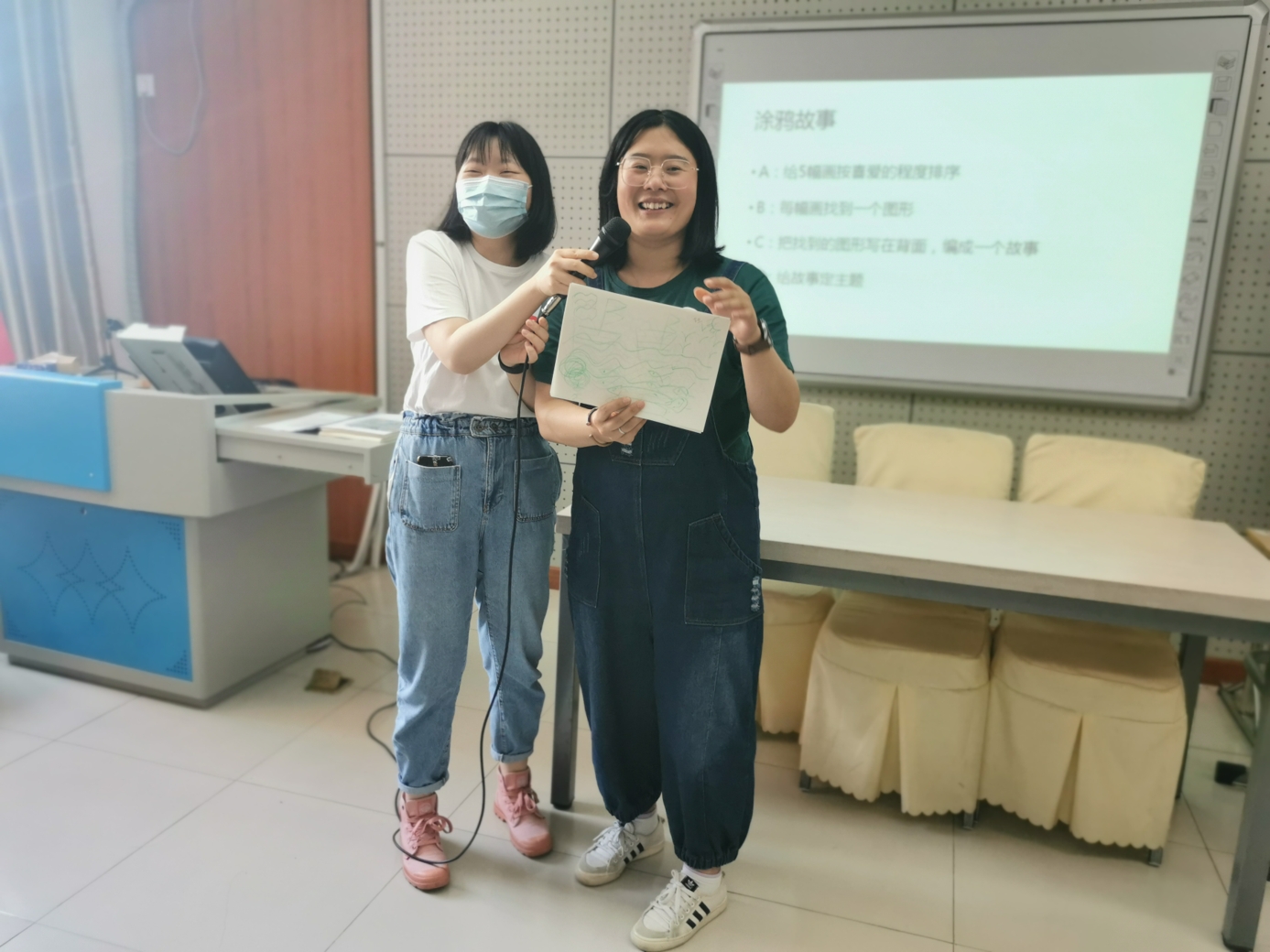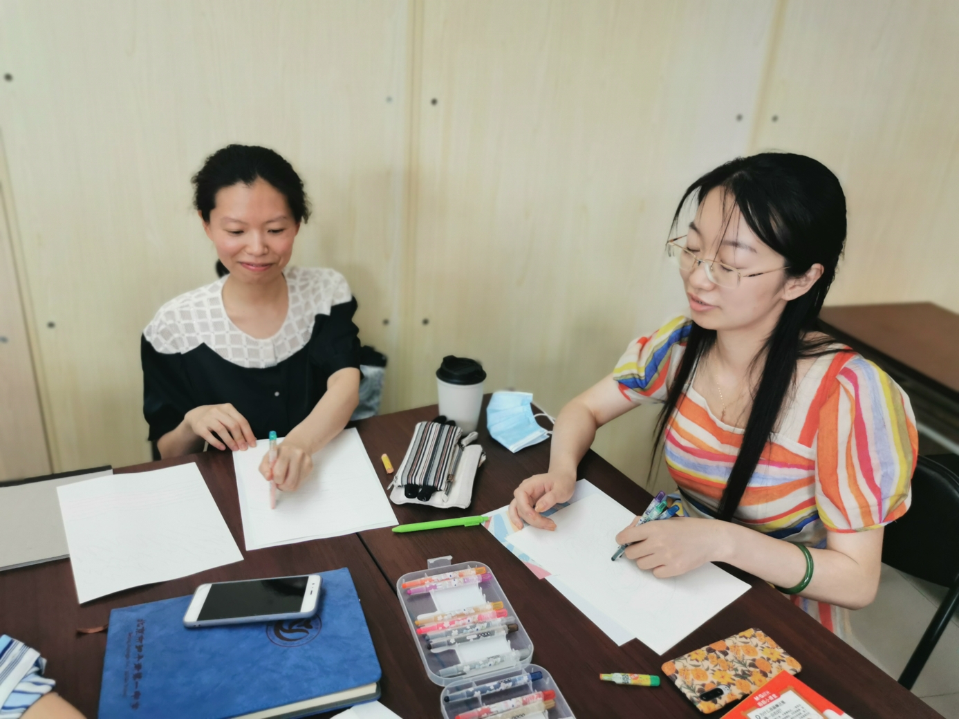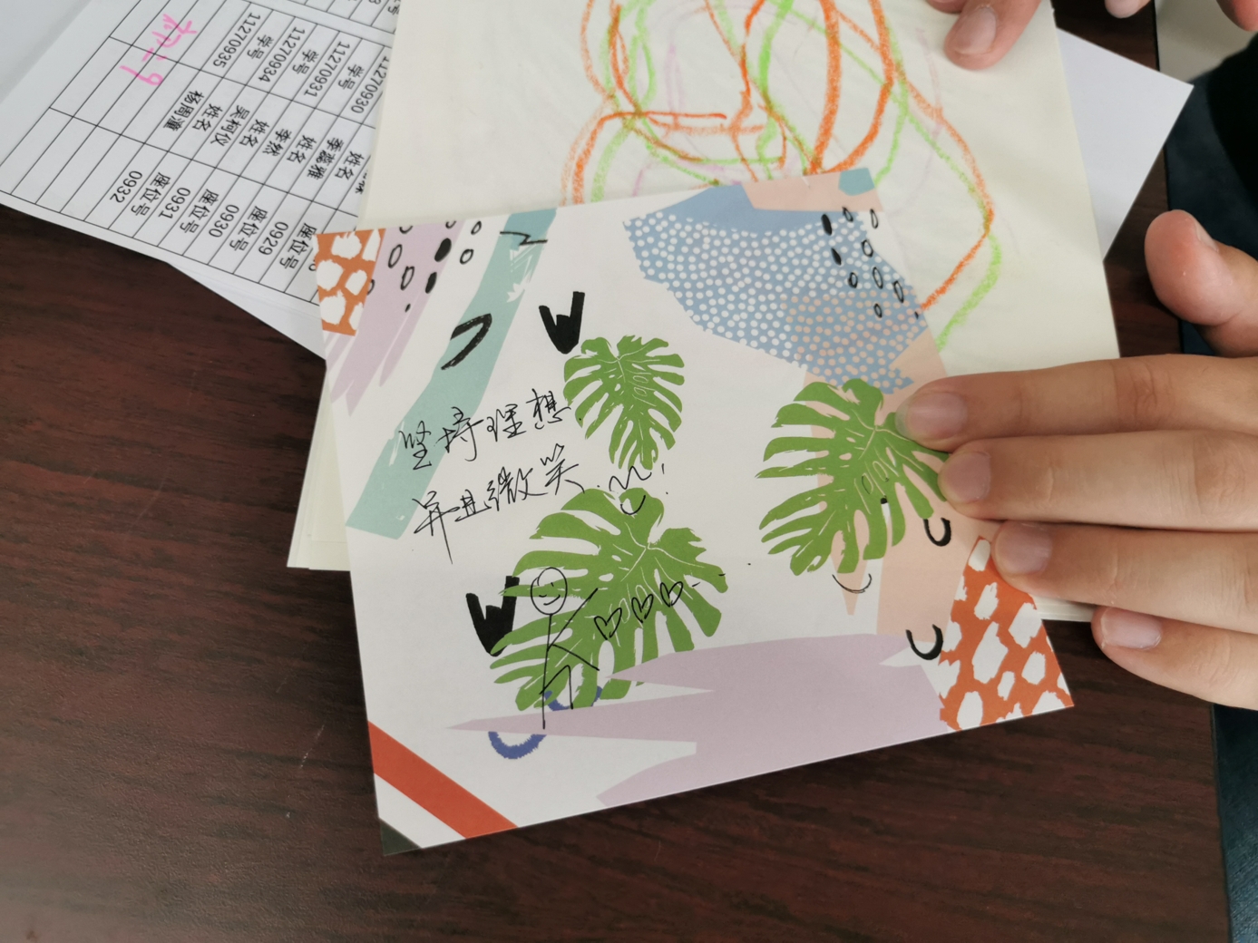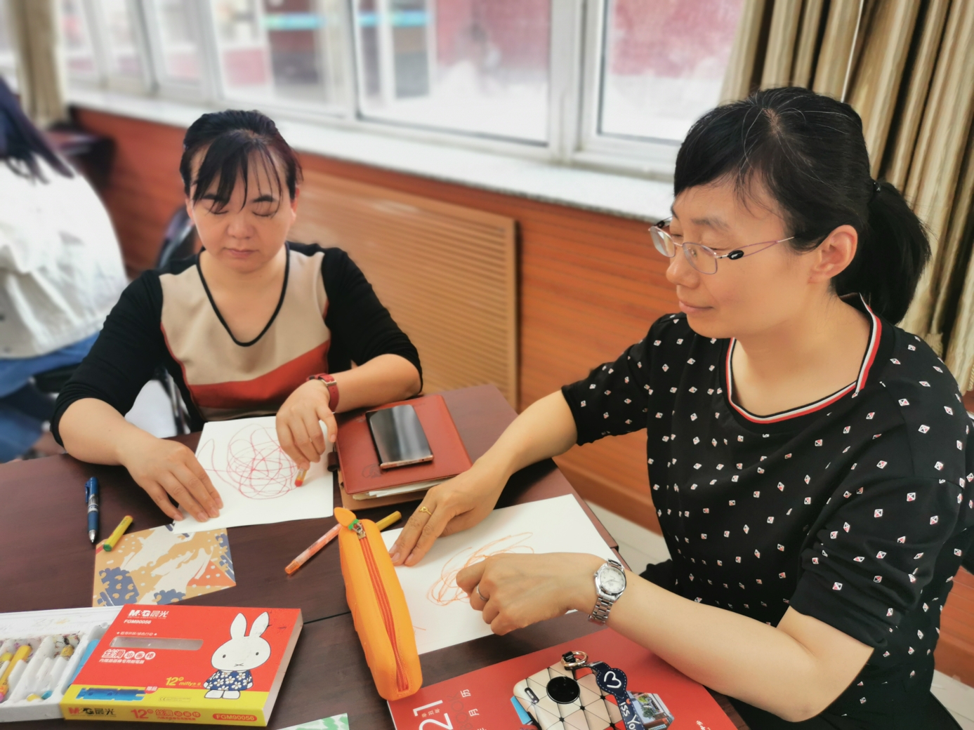 心理教师刘志宏首先以一个小调查引入活动,询问老师们在生活和工作中是否出现过一些难以名状的情绪。接着,在平静的背景音乐与柔和的引导语中,刘老师带领大家进行了一段正念冥想。每位参与的老师都闭上眼睛,跟随引导语进行着呼吸的专注和身体的放松。当老师们能够面对流淌于当下的情绪体验时,在舒缓的音乐背景中,老师们用不同颜色的蜡笔在纸上进行涂鸦,让情绪投射于纸上,并依照引导给自己的作品起名字,写下故事。老师们创作完还进行了分享,大家互相认真聆听,在分享中互相疗愈。最后,每位老师给自己写下了一句鼓励、充满爱意的话语。