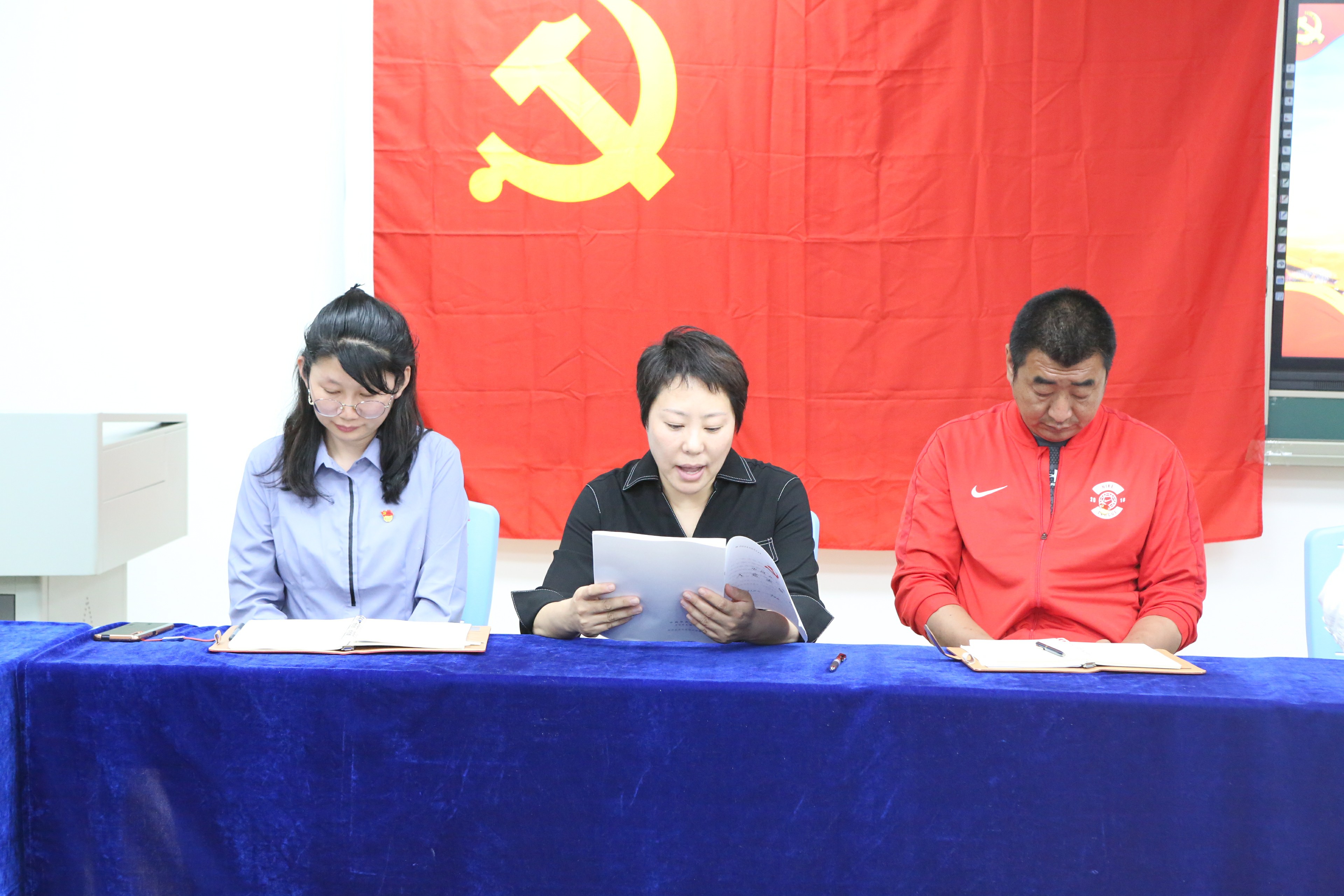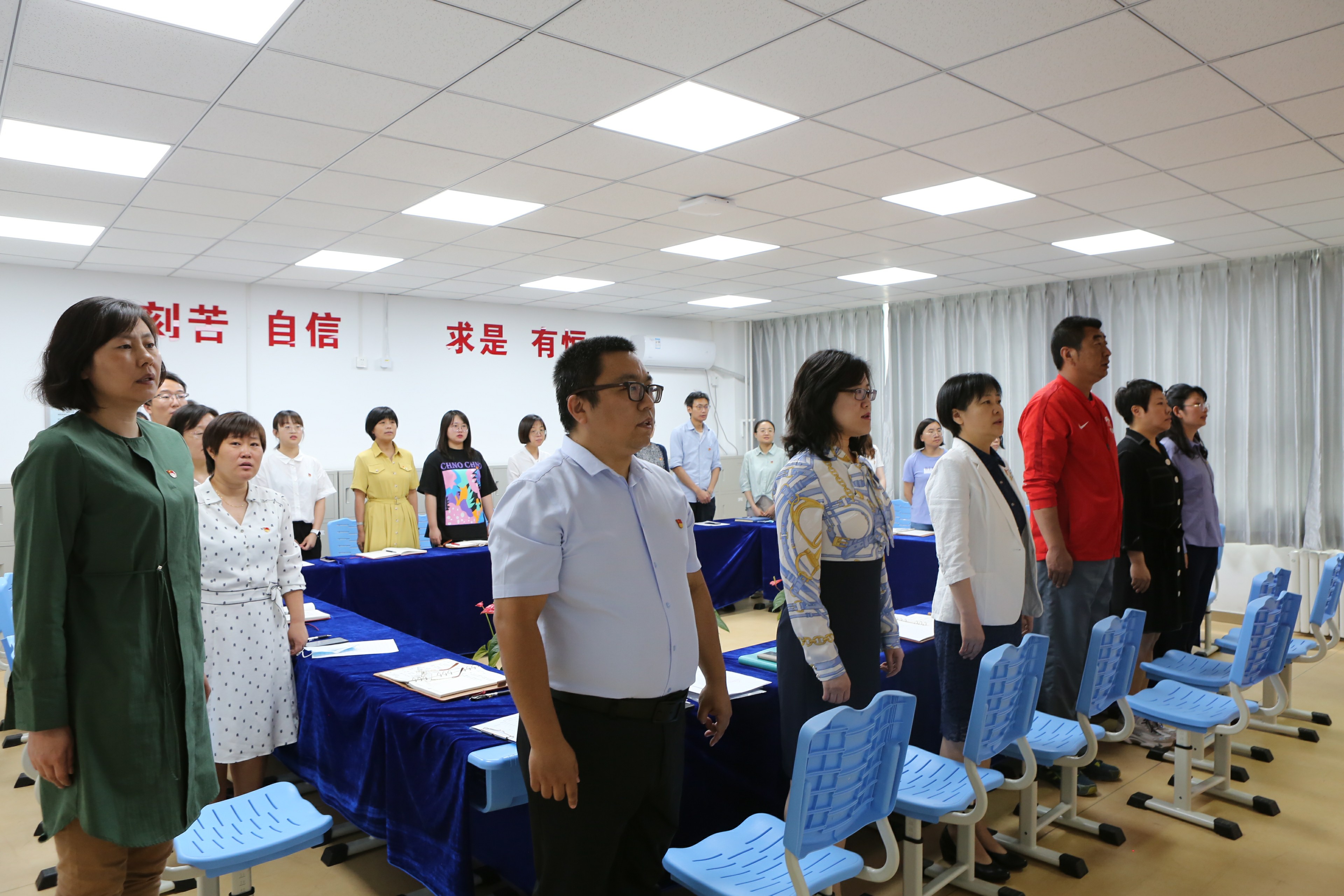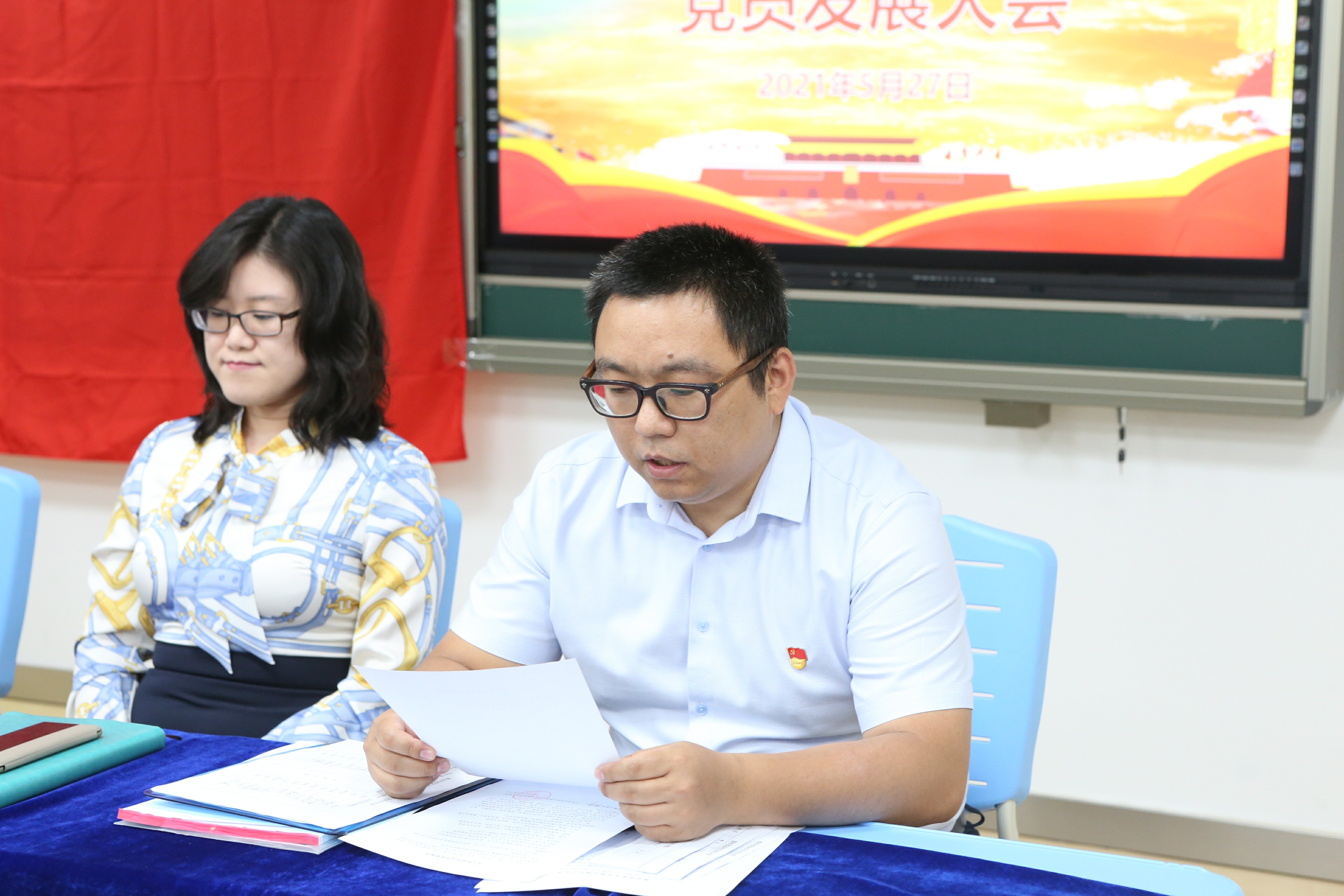 在雄壮的国际歌声中,本次发展会开始,按照程序首先由被发展人常连霞、张劼两位同志分别宣读入党志愿书,向全体党员介绍了自己的基本情况,汇报了自己工作的情况和思想成长历程,表达了入党的意愿。随后入党介绍人介绍了两位被发展人自申请加入党组织以来的政治思想和学习、工作中的进步与成长,并做了表态愿意介绍两位同志加入中国共产党。在组织委员代表支部向大会汇报了两位同志的政治审查情况后,全体党员严肃认真的讨论,通过支部全体党员的无记名投票全票通过常连霞和张劼两位同志加入中国共产党。 支部书记宣读决议后,两位被发展人也表示会虚心接受大家的意见,自觉接受党组织的考察和全体教师的监督。奥运村校区党支部书记周建萍副校长做了总结发言,对两位同志一直以来的努力和贡献给予充分肯定,两位同志作为区级骨干教师被发展加入了中国共产党,是我校积极推动与落实“双培养”工作的结果。她们的加入为党组织注入了新鲜的血液,希望所有党员同志坚定政治信念,携手共进为奥运村校区的发展贡献自己的力量。和平街一中党总支张静书记勉励党员们,行为上入党是一生一次,思想上入党是一生一世。