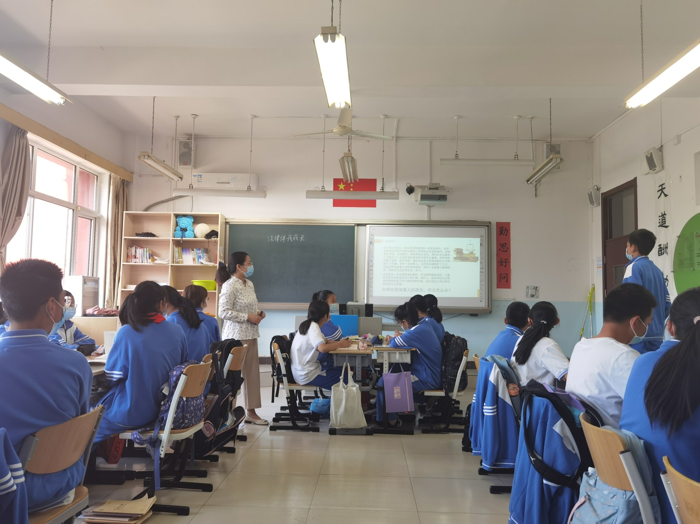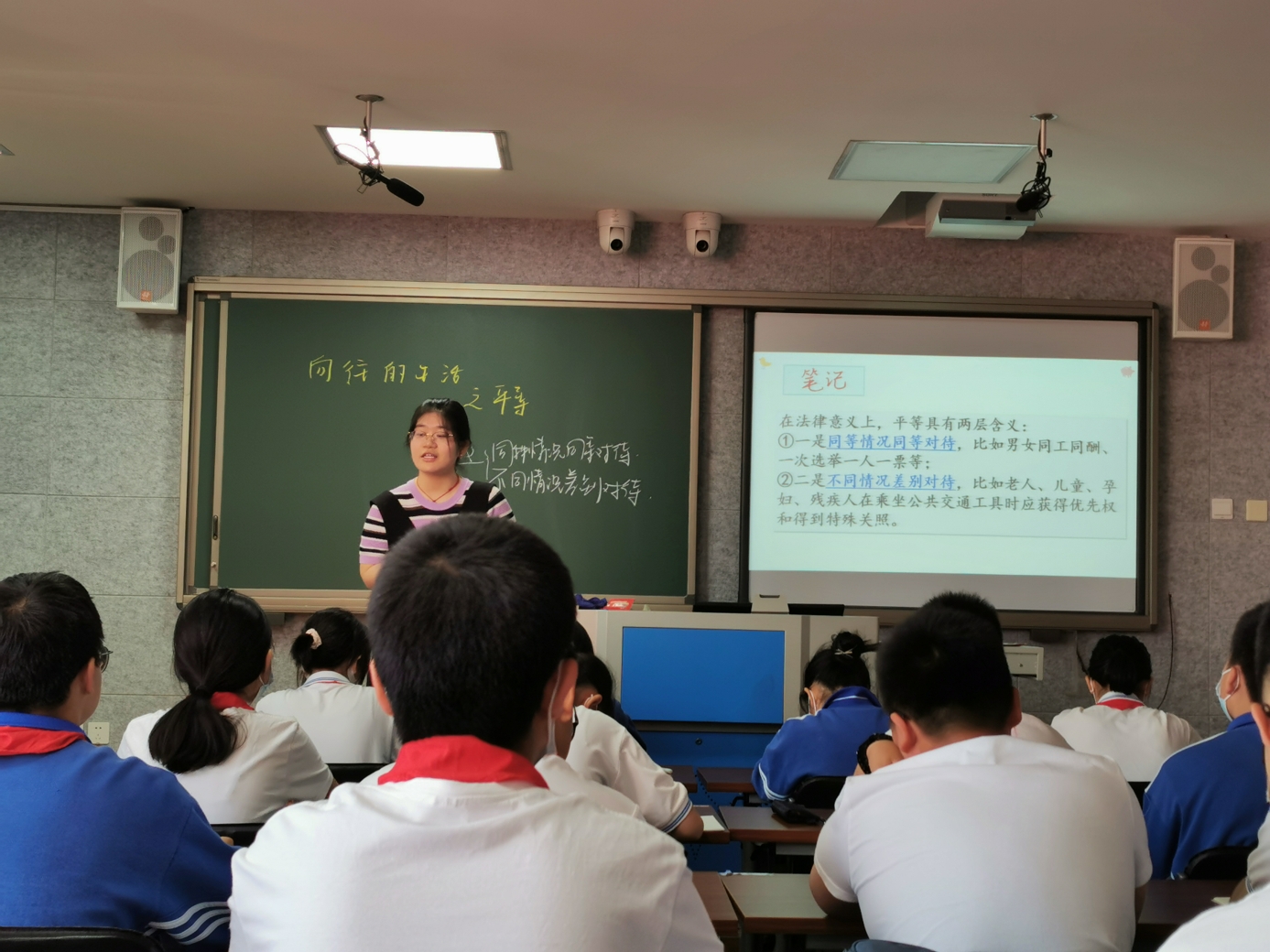 张晓玲老师在初一10班教室准时开启序章,展示了七年级下册大单元设计下的教学《法律就在我们身边》,张老师将法律的作用和违法行为类别结合起来,以刑事责任年龄的界定为主线,探讨法律的规范和保护的作用以及对于保护未成年人的六大保护。紧接着,杨雪茹老师展示了八年级下册大单元设计的教学《向往的生活之平等》,围绕着平等是什么、为什么和怎么做的主线开展教学,结合社会生活中有争议的案例来讲授平等上的法律,学会法律上的平等讲求法律面前人人平等以及人格上的平等,培养学生的法治精神的核心素养。