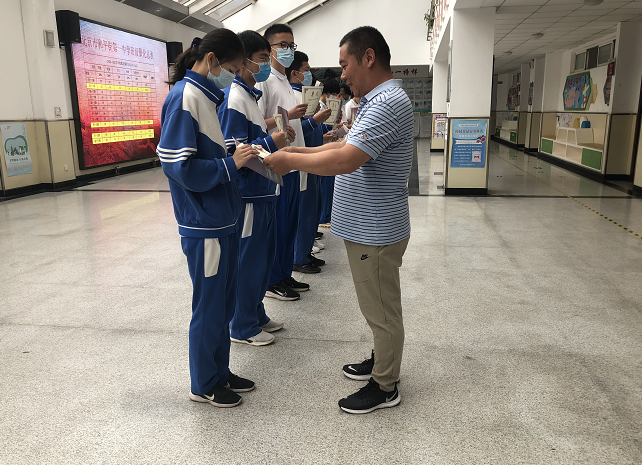 初三(7)班的李佳宜代表老队员发言并把国旗交到新队长初二(18)班的潘艺文手里。这意味着老一届国旗班将自己守护国旗的使命交到下一届的“新鲜血液”手中,让他们继续守护国旗、坚守使命。潘艺文同学代表新队员说道:“我们会努力让大家看到一个充满责任感、优秀而又出色的新一届国旗班!”相信新一届国旗班必将不负使命,守护国旗,传承爱国精神。最后,张东辉主任为初三年级国旗班成员颁发奖状和纪念品。
