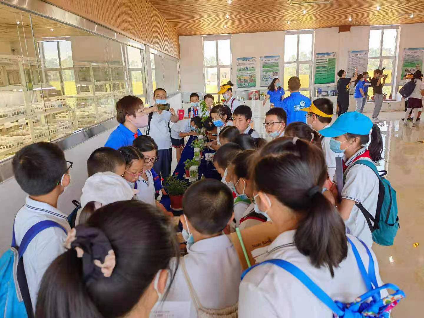 同学们拿着写有任务的任务卡边参观、边记录:通过生动的航天工程讲解和面对面的交流方式激发起孩子们对航天工程育种的好奇;精彩的宣传片萌发了同学们对航天工程育种的兴趣;积极参与科普问答互动。