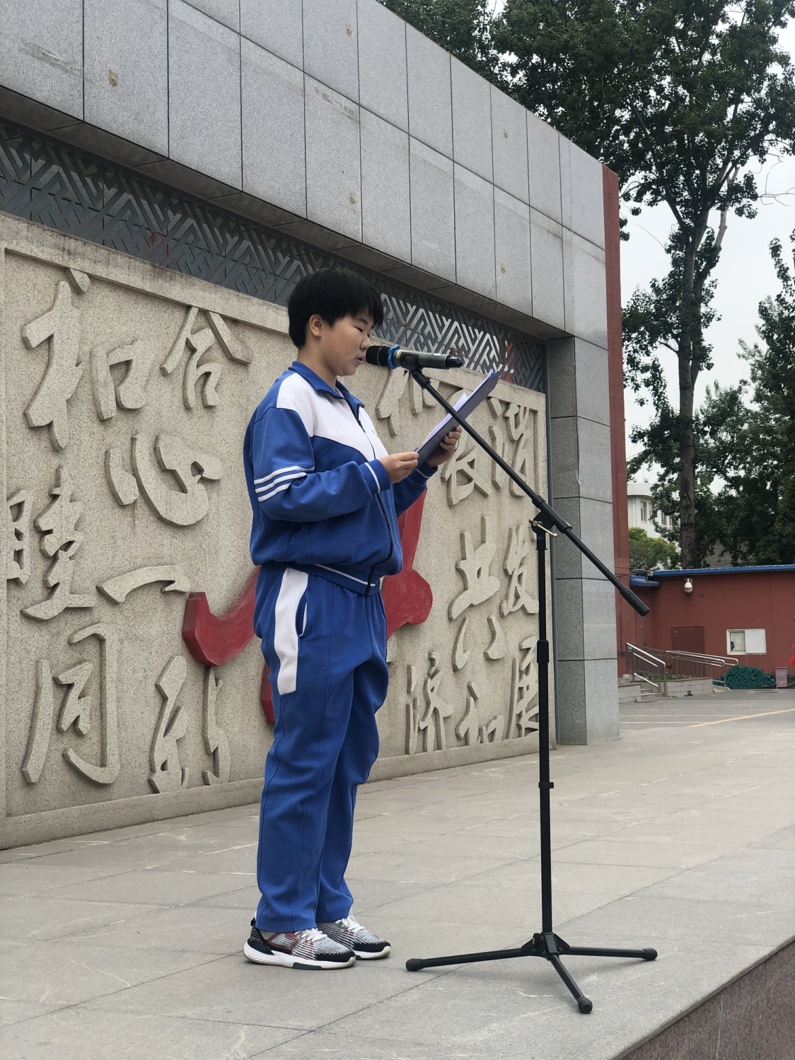 最后,大会还进行了升旗仪式新老主持人的交接仪式,初三2班翟俊达同学正式向全校师生介绍新的主持人,来自初一9班的崔家铭同学,并发表了自己的离别感言,感谢老师与同学的信任与支持。