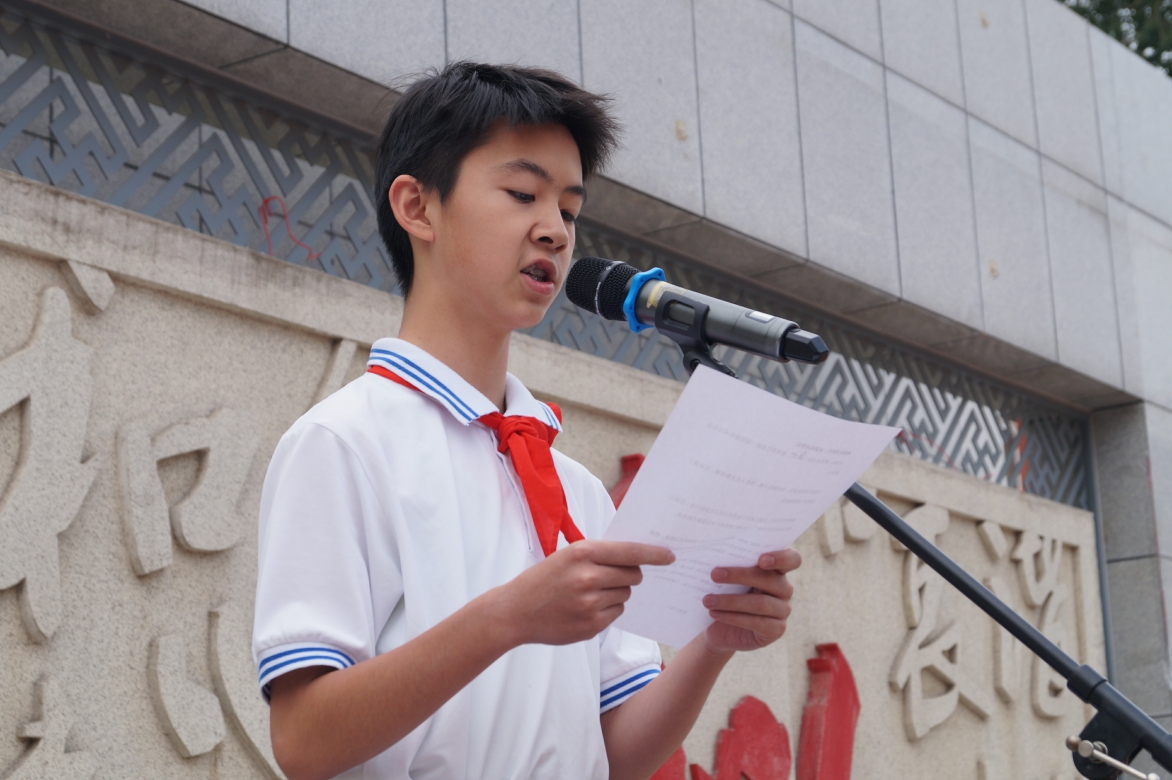 作为新一届国旗班代表初一7班盛和同学首先向老国旗班成员致敬,感谢前辈这一年来的辛苦付出,同时带领第三届全体成员向全校表态:他们会接过重担、牢记责任、继承国旗班的优良传统,发扬国旗班不怕吃苦精神,认真训练,用辛勤的汗水,为国旗班赢得新的辉煌。