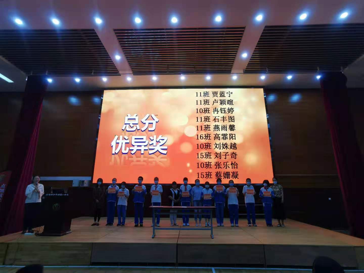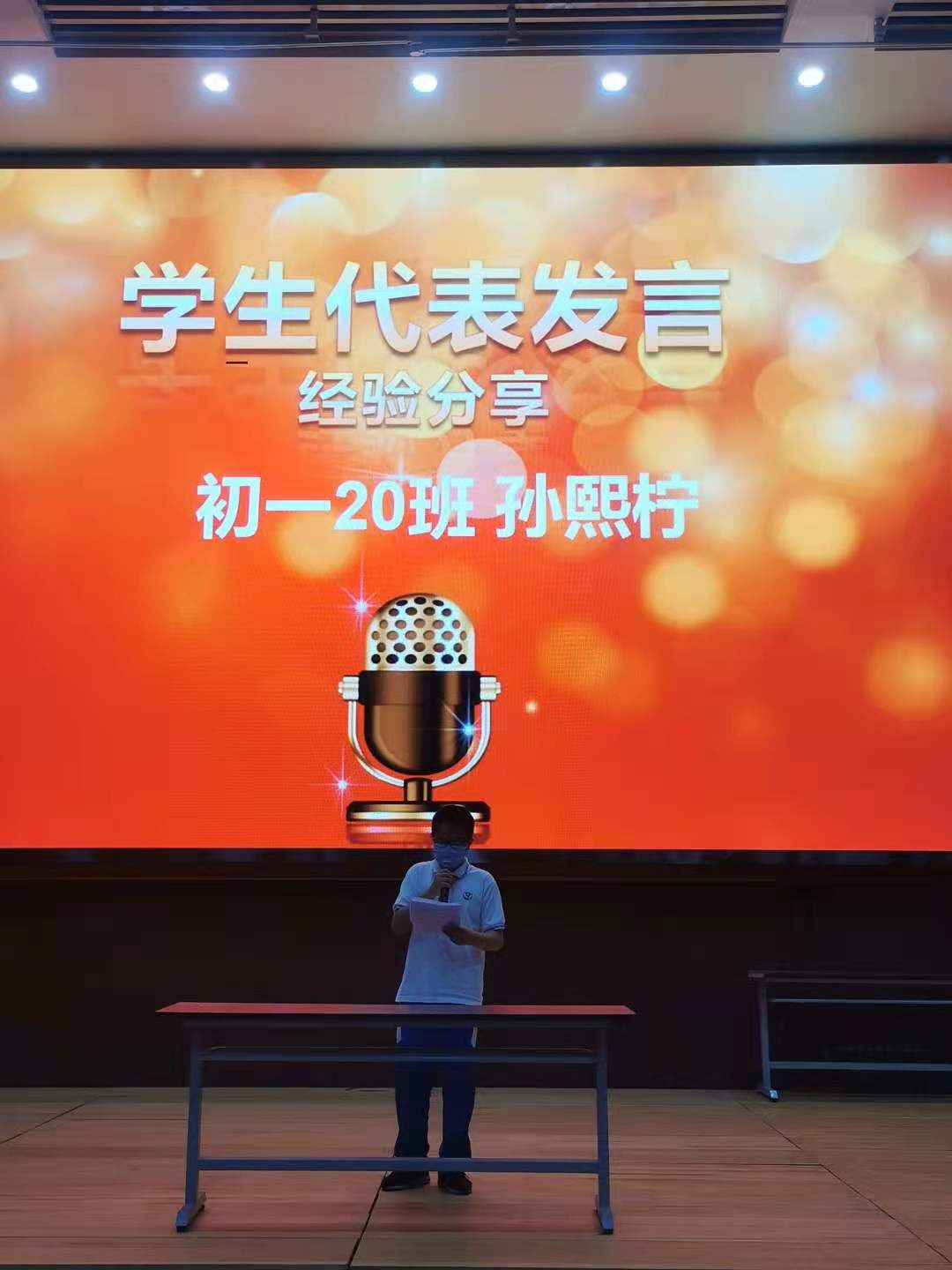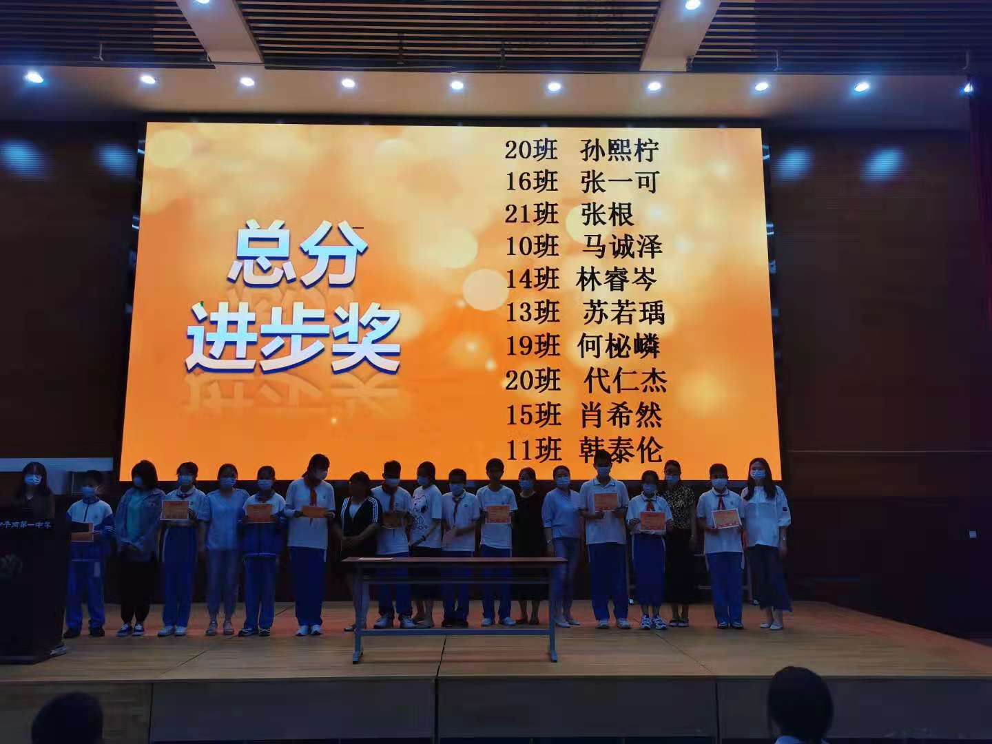 会议的开始陈老师为了激励更多同学燃起对学习的动力,对期中考试中表现突出的学生进行了隆重地表彰,为总分优异和总分进步大的同学颁发了荣誉证书,还对初一各班最具潜力的学生进行了提名和表彰。随后,初一20班孙熙柠作为学生代表分享了自己在学习过程中总结出的一些行之有效的小妙招,台下同学用心听记,反响很好。