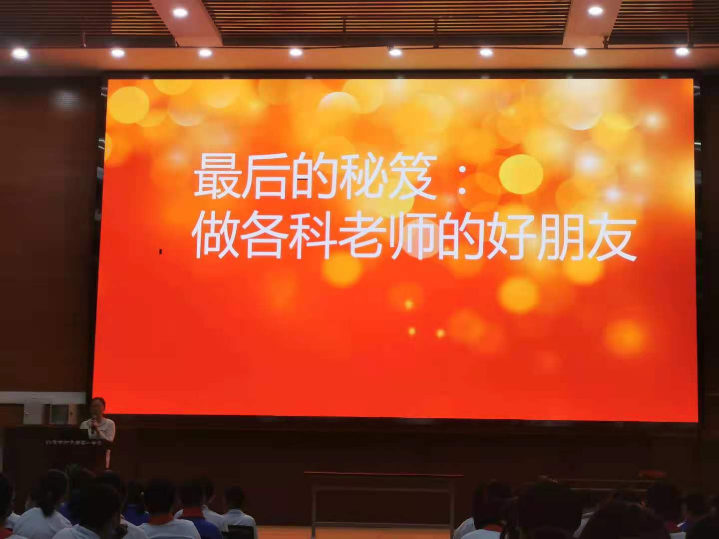 接着陈老师从教师的角度也为同学们提供了一些复习策略:第一,制定合理的复习计划;第二,完整地看一遍教材;第三,明确重点,攻克难点, 侧重疑点;第四,讲究方法,适当做题;第五,调整心态,考前虚心考时自信。陈老师是还给同学们提供了最后的秘笈:做各科老师的好朋友,鼓励大家多跟老师有效沟通,良好的师生关系是学习进步的制胜法宝。