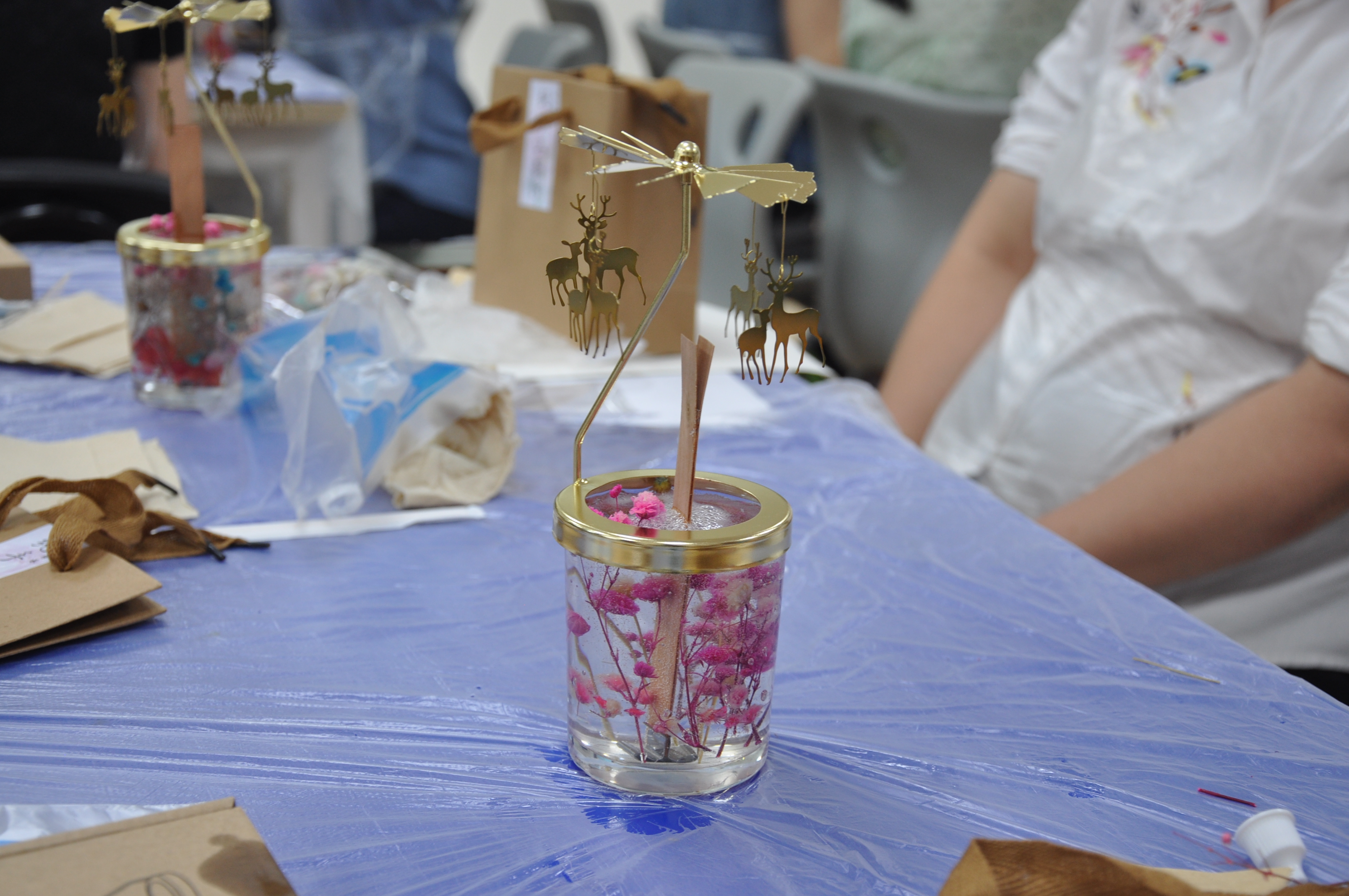 首先由专业教师为大家讲解了香薰走马灯的基本原理和知识,接着介绍了制作工具和使用方法,随后在专业教师的指导下,老师们纷纷开始了自己的创作。全校教师积极参与,用心体验。蜡烛在美丽的走马灯装饰下挥发芬芳香气,净化心灵。蜡烛中的干花都由老师们自行搭配,精心构图,每个人都创造出了精美的微景观。每一款作品都是如此的别出心裁。
