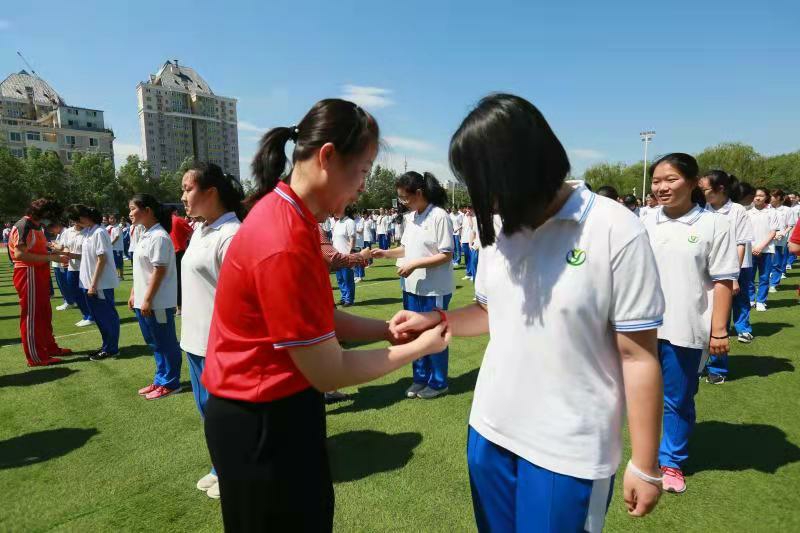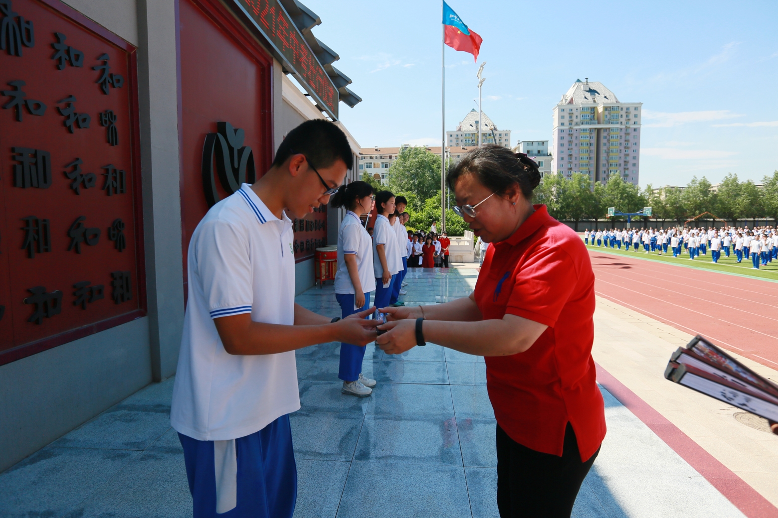 接下来,朝来校区主管校长张景鲜为初三各班颁发毕业礼物“和一吉祥扇”, 立志、勤奋、求实、开拓是我校的校训,希望和一学子能谨记校训、传承校训。随后,全体教师为即将出征的初三学子系上祝福的红绳。红色,是祝福的颜色。根根红绳,代表着老师们最真挚的祝愿,一祝你们绳锯木断,水滴石穿;二祝你们脚踏实地、志存高远;三祝你们约之于礼、博学于文;四祝你们孜孜以学、进取思辨;五祝你们学有所成、中考大捷!