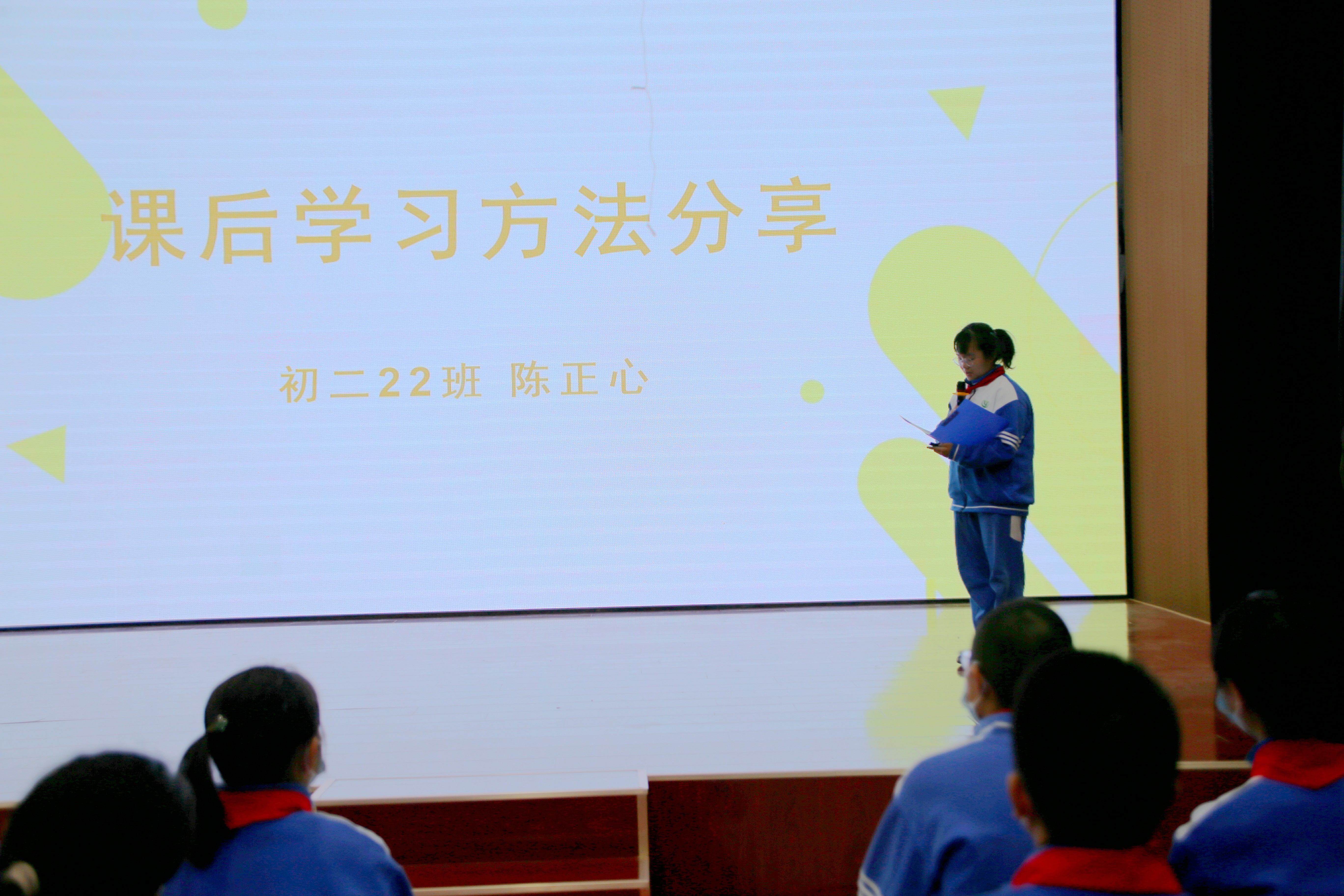 “断舍离”能帮助我们保持初心,重获幸福,初一(20)班程逸轩同学结合自己的亲身体验告诉同学们如何做到断舍离。这次月考,许多同学的数学成绩都不理想,初二(24)班蔡睿轩同学给大家讲了如何才能学好数学。优异的成绩离不开适合的学习方法,初一(19)班周家禾同学从上课如何听讲,如何做笔记以及如何提高学习效率三方面给大家分享他的学习心得。如何高质量地完成作业,是大多数同学比较困惑的事情,初二(22班)陈正心同学从预习和复习两方面谈了自己的方法。初一(21)班叶子轩同学爱好朗读,他将告诉我们一些朗读的技巧,帮助我们更好的去理解文章,更好地阅读。初二(24)班崔家宸同学在这次学期中的统一练习进步显著,她与大家交流了如何通过“真努力”取得进步。最后,道法老师王彬通过自身的成长经历,告诉同学们只有努力拼搏,坚持不放弃,才能取得最终的成功!