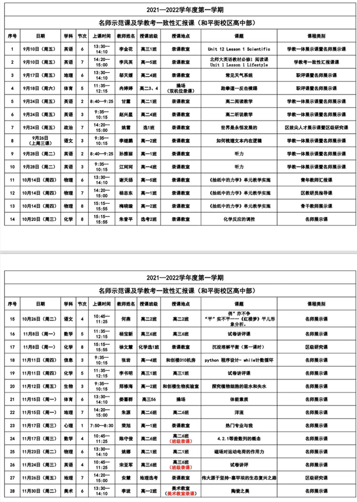 为进一步提升学校教育教学质量,提高教师教育教学水平,形成教师之间互相学习的浓厚氛围,更好地发挥名师的辅射带动作用,感悟名师课堂教学的魅力,促进学校教师专业化成长,根据学校教学工作的整体安排,2021年9-11月,和平街一中和平街高中校区教学处组织开展了为期两个多月的名师展示课活动。本次活动共安排了高中3个年级12个学科20节展示课和8节市区级公开课,承担展示课和公开课的教师中有5位特级教师,4位市级称号的教师和11位区级称号的教师。授课教师都能积极准备,全身心投入,主要围绕“学教考一致性”单元设计教学,通过学案、小组合作等方式,使得课堂教学精彩纷呈。听课教师们专心聆听,认真记录,不仅学到了授课教师扎实的专业知识,也向老师们学习了如何调动学生、关注学生课堂知识的生成等教学技巧。