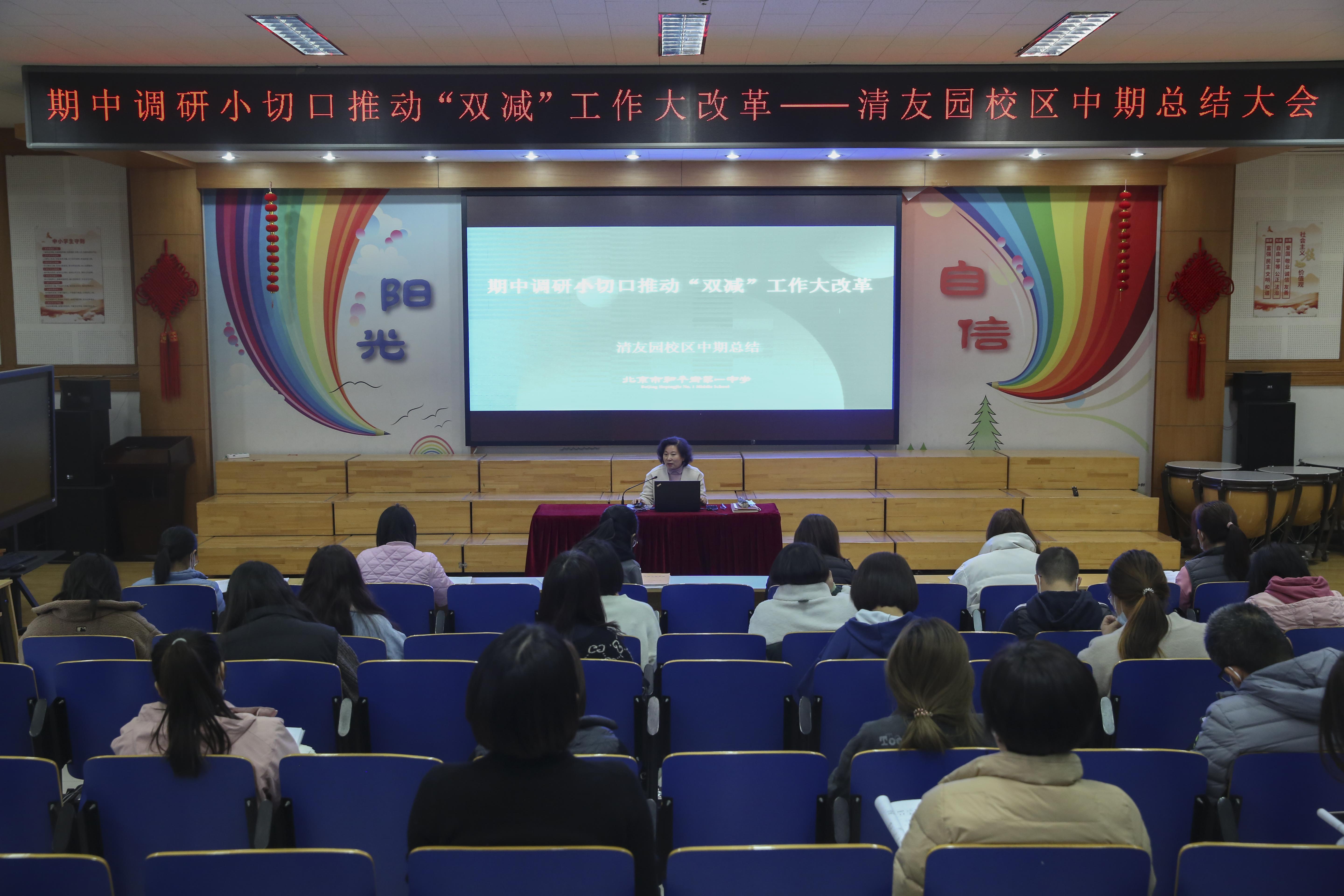 为进一步落实“双减”工作要求,切实提高课堂教学质量,提升教师教学能力和管理水平,打造一支高素质、专业化、创新型的教师队伍,全面推动“双减” 工作大改革,2021年11月29日下午,清友园校区利用期中调研召开阶段性总结大会,校区主管校长殷桂萍主持会议并讲话,德育主任何凤驰、张馨文,大队辅导员王焱本以及全体班主任参会。