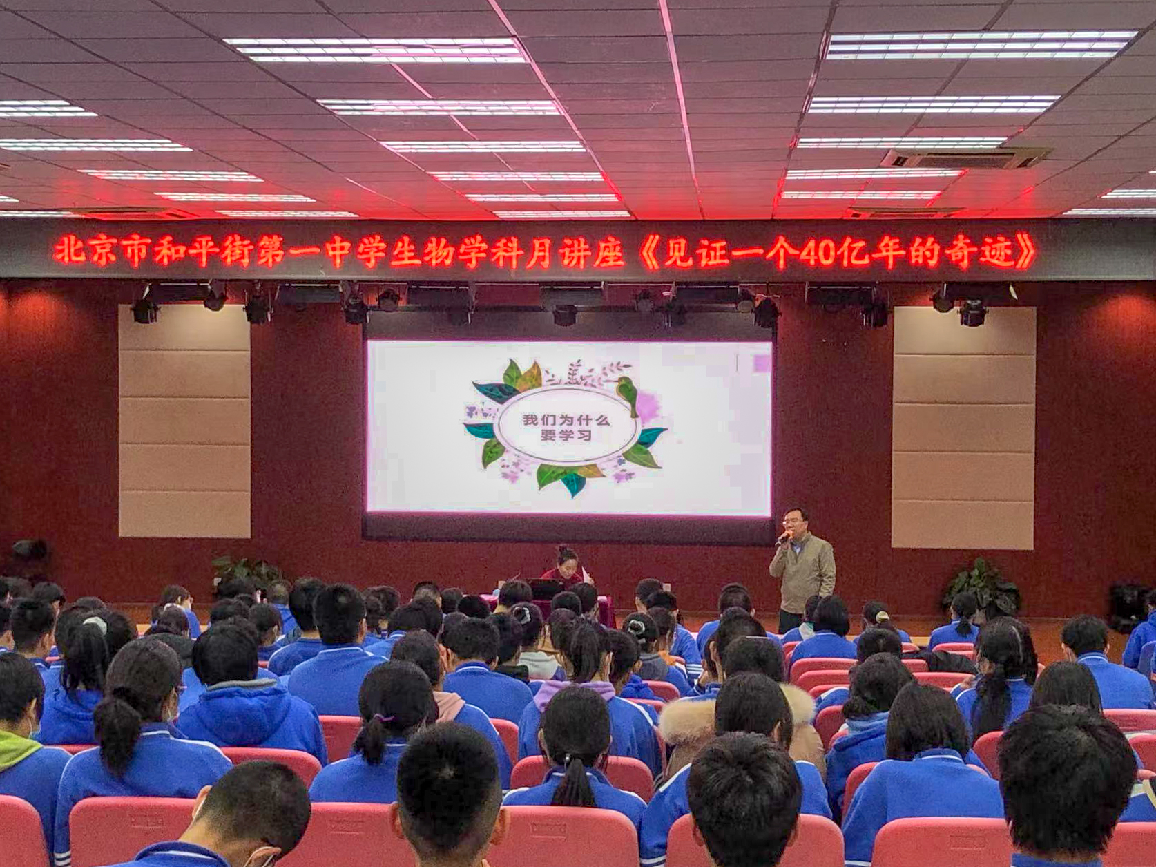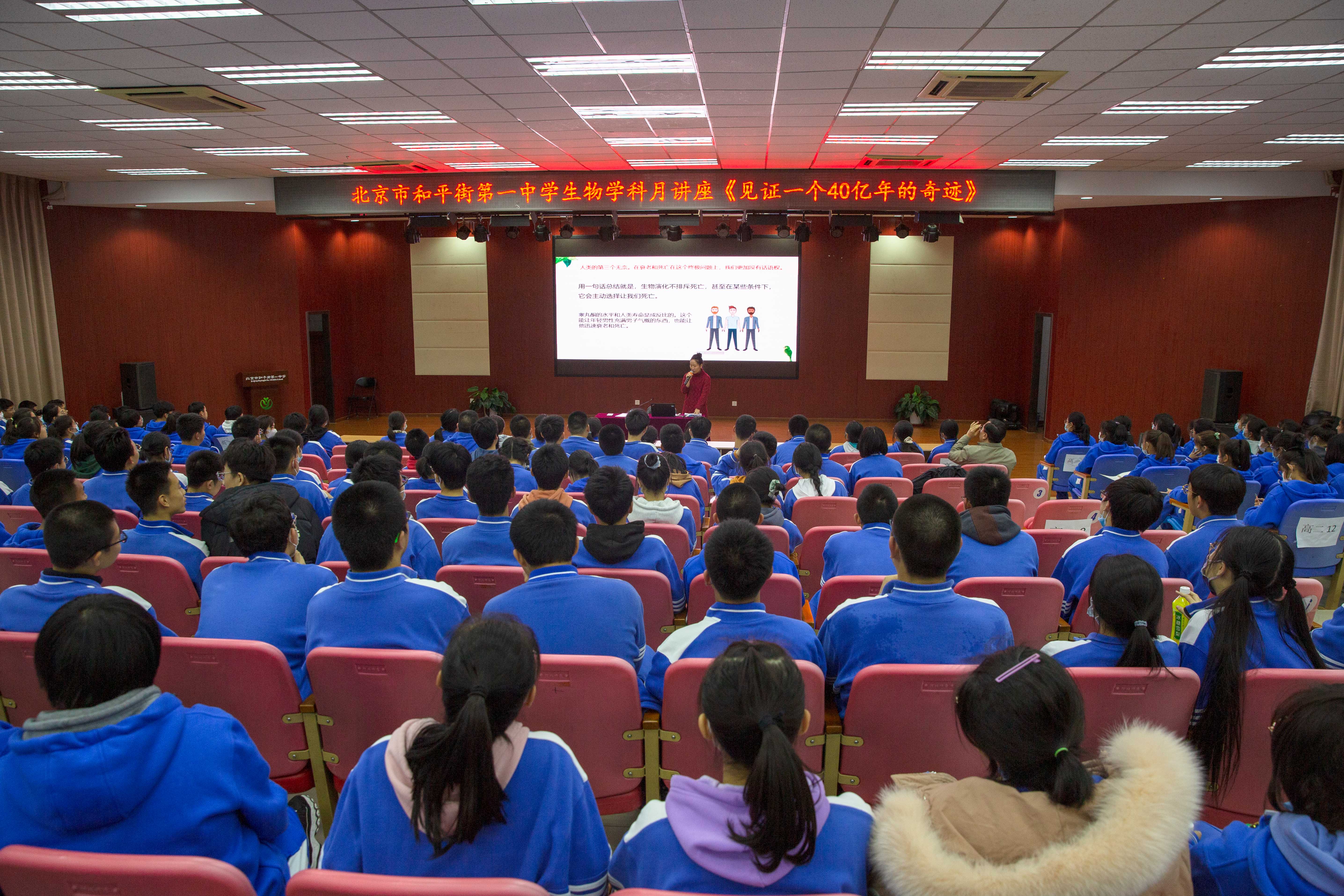 2021年12月1日下午,北京市和平街第一中学莲葩园校区生物学科月科普讲座活动在五层阶梯教室举行。本次科普讲座的题目是《见证一个40亿年的奇迹》,由肖德慧老师担任主讲,高一、高二两个年级三百名学生以及生物教师、高一年级组长程瑞芬老师及高一年级全体班主任、高二年级组长赵楠老师等全程参与了此次活动。
