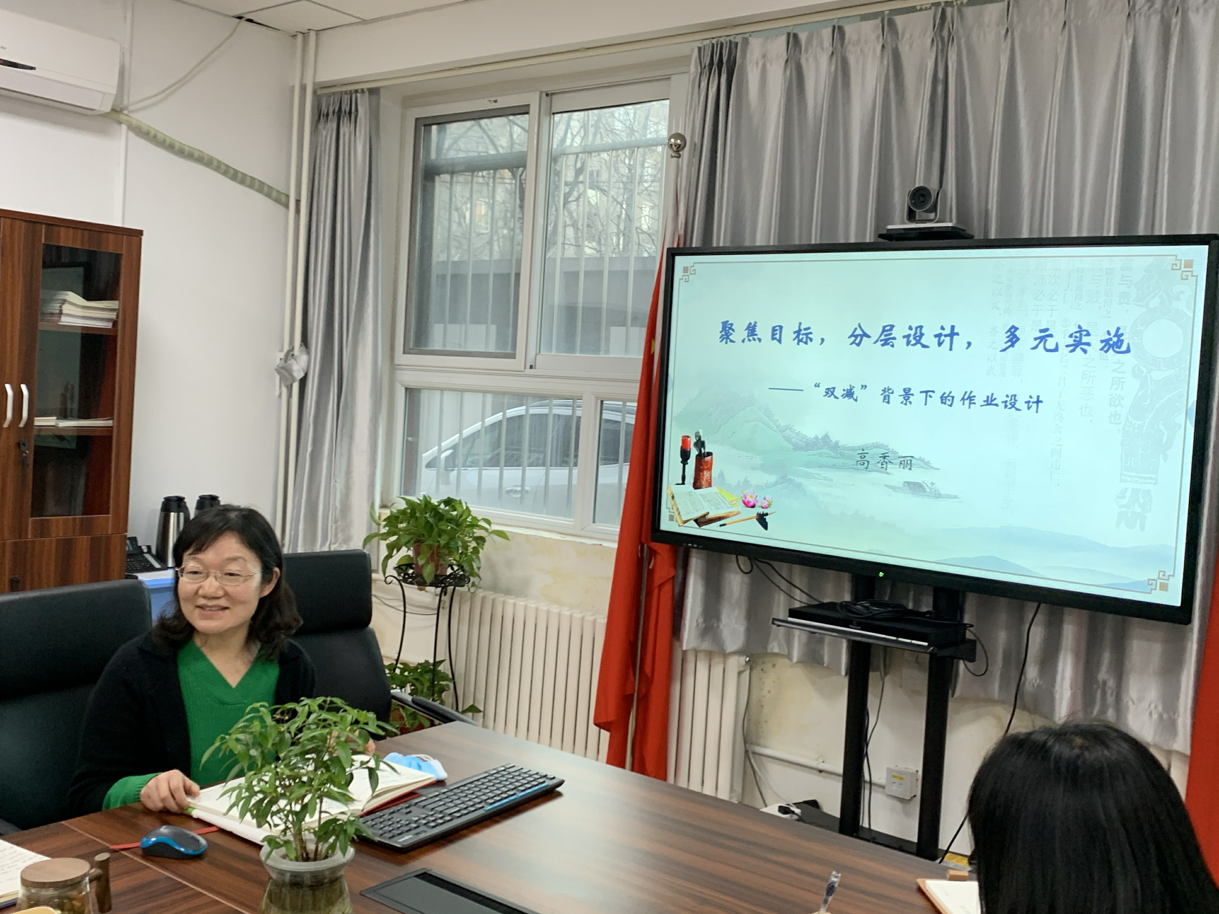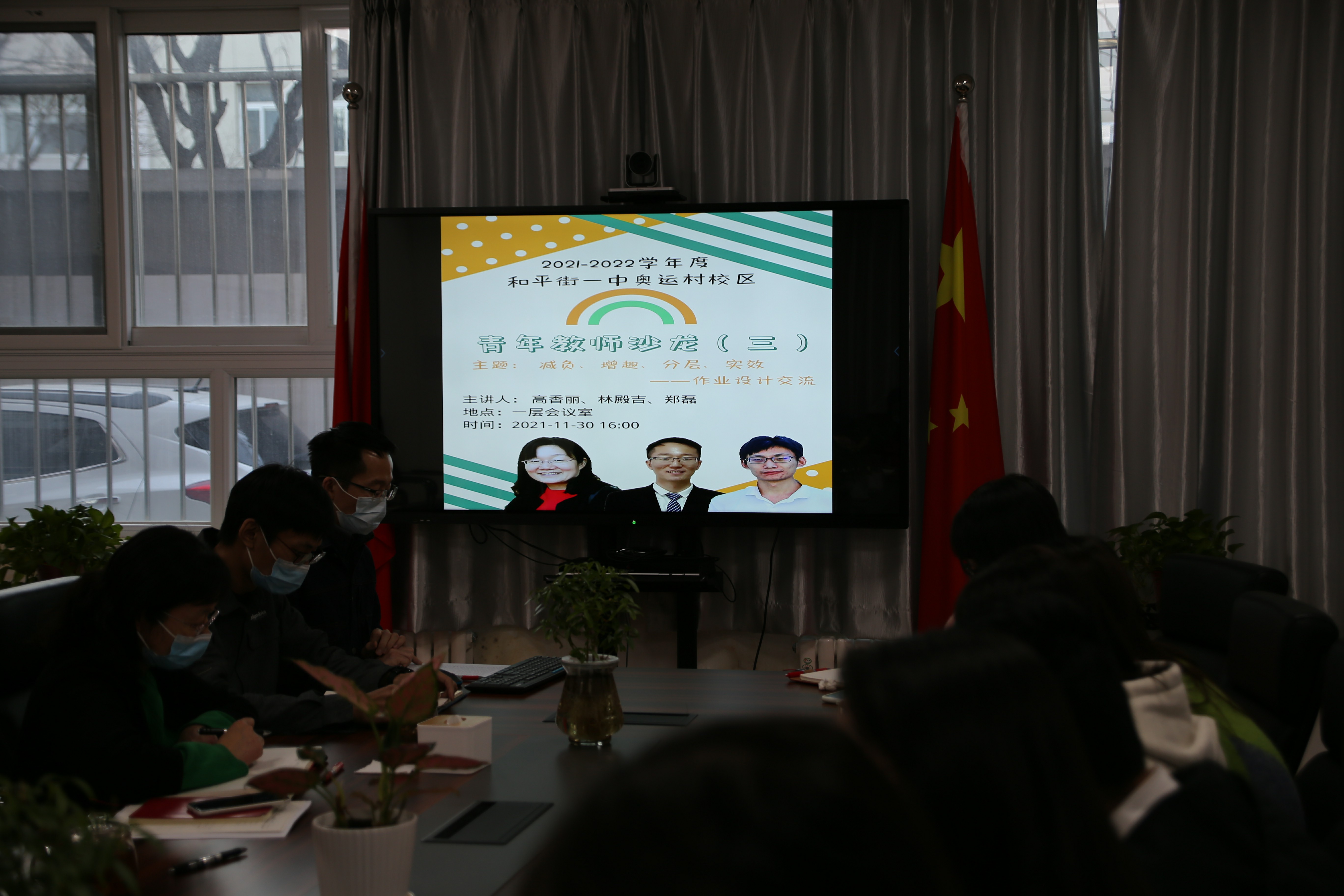 2021年11月30日星期二下午4:00,和平街一中奥运村校区举办了本学年度第三次青年教师沙龙活动。本次活动的主题为“减负、增趣、分层、实效------作业设计交流”,邀请语文教研组组长高香丽作辅导报告,数学老师林殿吉、物理老师郑磊作了交流发言。奥运村校区全体青年教师参加此活动。冯英主任主持活动并作总结发言。