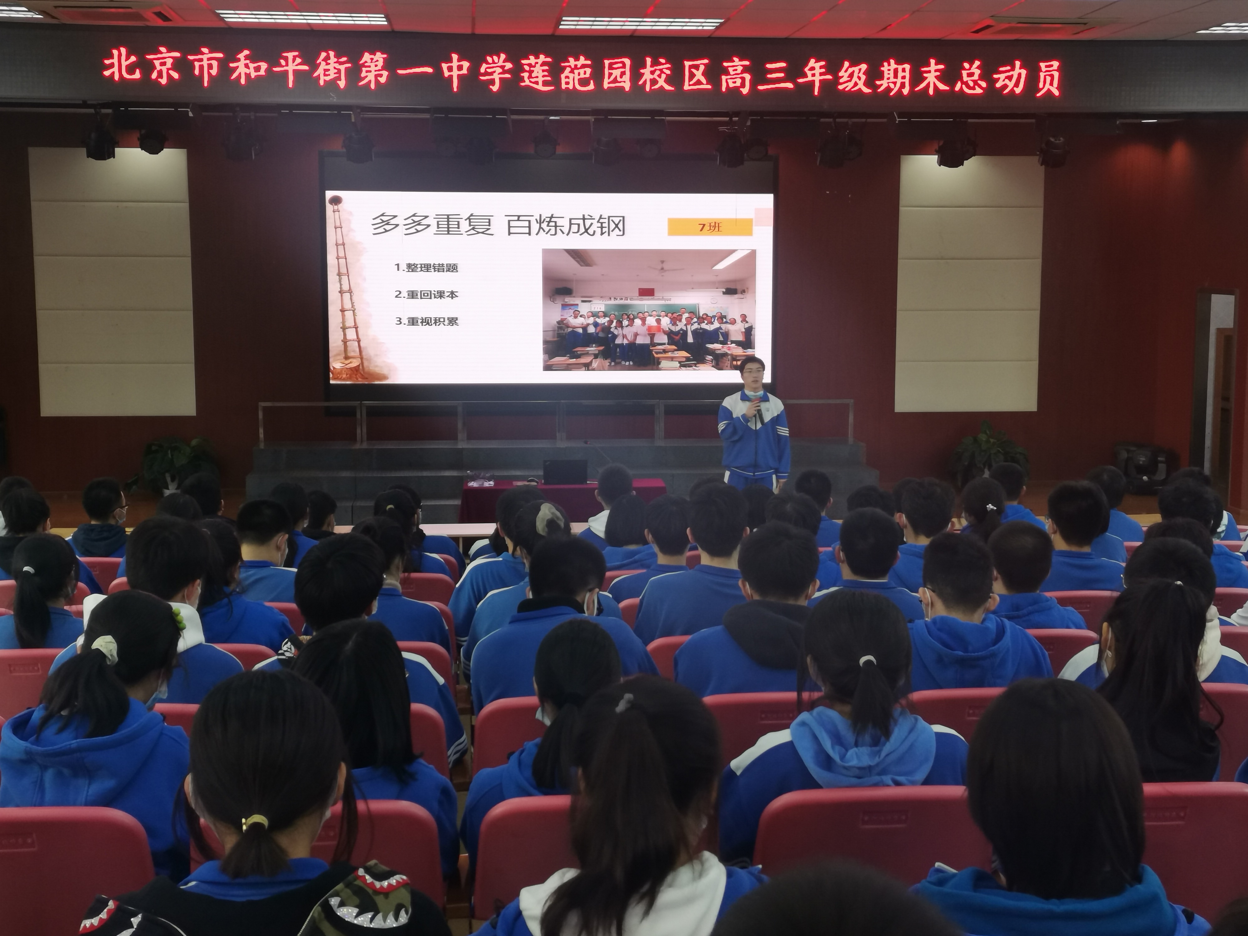 为了更好地帮助高三学生调整学习状态,激励高三学生积极备考,2021年12月21日15:15,在北京市和平街第一中学莲葩园校区五层阶梯教室召开了2021-2022学年度第一学期期末高三年级考试动员大会。刘堃主任、刘红艳年级组长、高三年级班主任老师和高三全体学生参加了动员会。