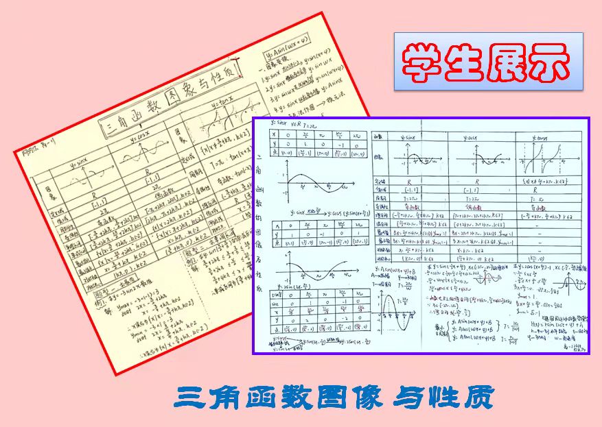 为此,刘波老师和王云霞老师分别绘制了两个单元的结构图,对学生进行了具体示范和指导。比如在“三角公式”单元中,要体现出“三角函数定义”是所有公式的本源,还可以标出“诱导公式” 与“和差角公式”是特殊与一般的关系等。对于学生意识不到的问题,我们又强调了一些细节,比如要突出中央关键词,要用同颜色彩笔标注同一层级的主题词,注意版面布局的美观性等等。