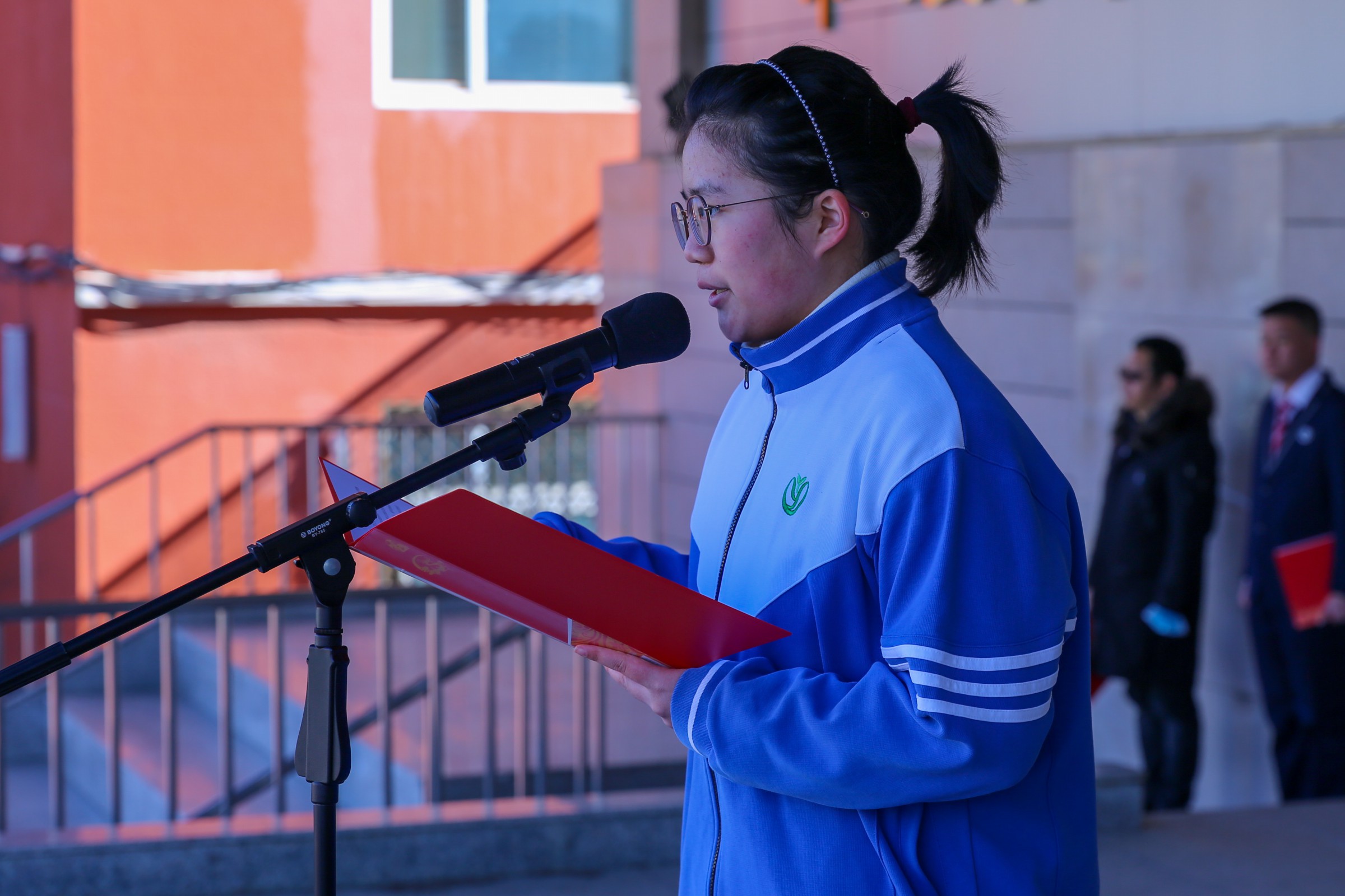 莲葩园校区的学生发言由高一7班郑雨笛担任。上学期,她作为学生代表在中国科技馆地面主课堂和王亚平的女儿一起近距离感受了这场天地连线,并参与了水膜实验的创意。寒假期间,她还有幸成为学生代表之一,走进奥运赛场,观看了冬奥会冰球比赛。她鼓励大家抓住学校提供的平台,将无怨无悔的合作与奉献精神,敢为人先的创新与开拓精神,以及自强不息的拼搏与奋斗精神融入学习生活中。