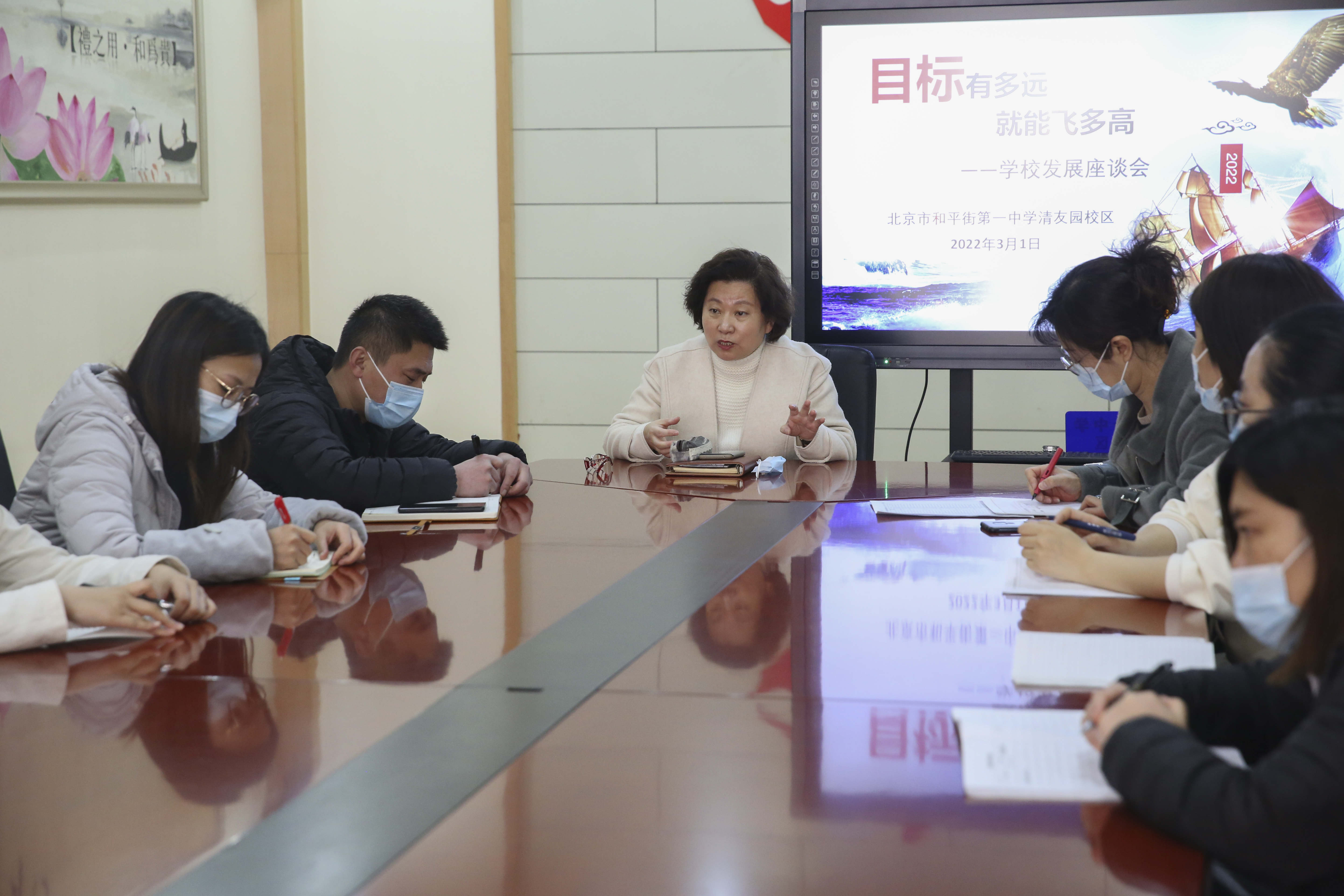 2022年3月1日上午,北京市和平街第一中学清友园校区召开了题为“目标有多高 就能飞多远”的学校发展座谈会。校区主管校长殷桂萍主持会议,办公室主任熊玉荣以及校区教师代表共13人参加座谈会。
